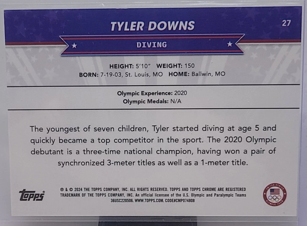 2024 Topps Chrome US Olympics Tyler Downs Gold Refractor Parallel /50 Diving #27. Condition is Ungraded. Shipped with eBay Standard Envelope for Eligible Items up to $20.