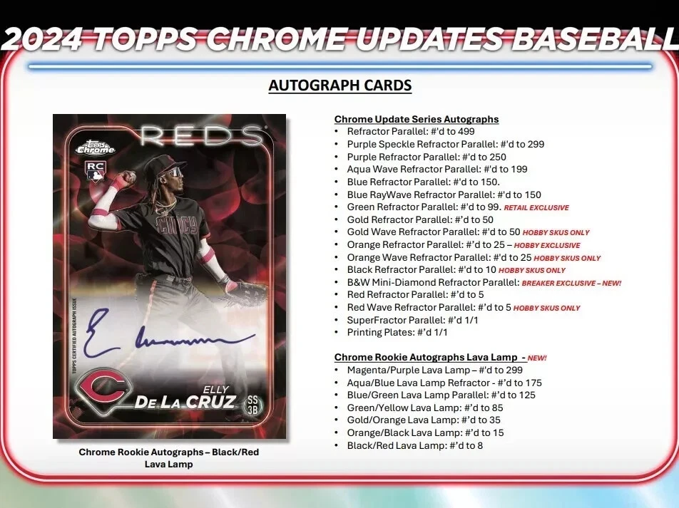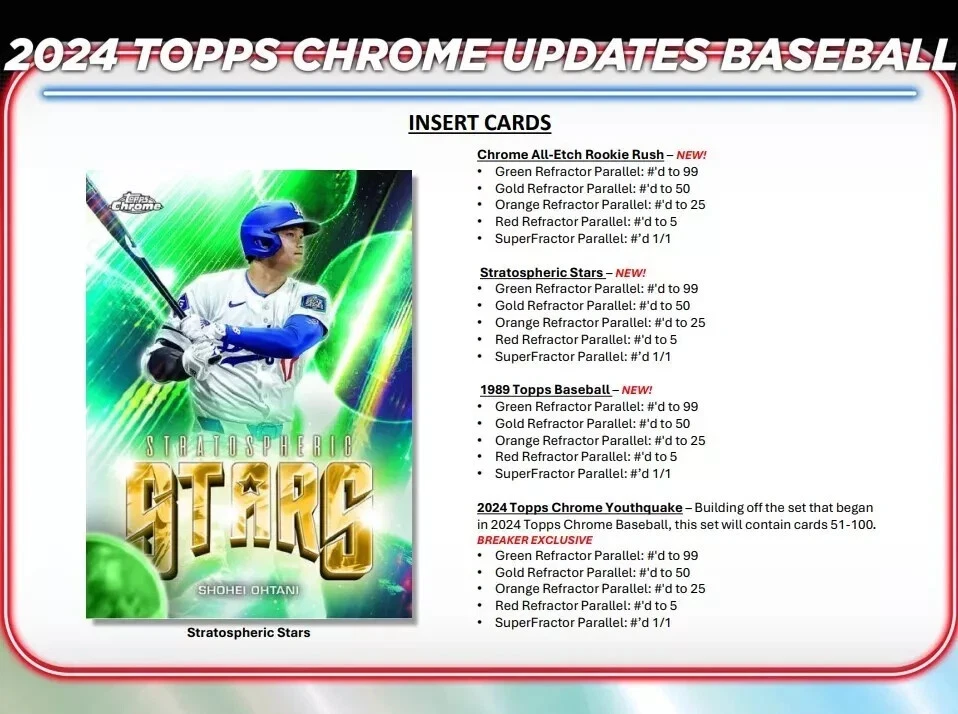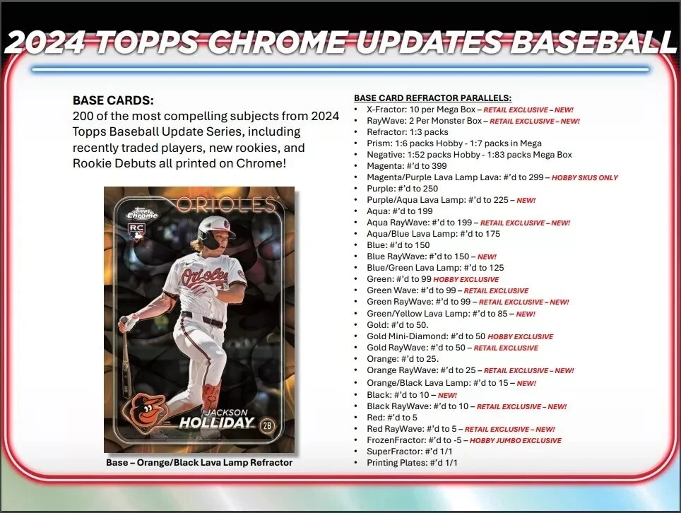 One mega box of Topps Chrome Update Series baseball cards. This factory-sealed box includes 7 packs containing 4 cards each, for a total of 28 cards. Each box is guaranteed to include 10 X-Refractor parallels, 1 prism refractor parallel, and 2 Raywave parallels. In addition, f ind all-new Chrome Update Series exclusives including: autographed rookie cards, Rookie Debut Patch Autos for 150+ Rookies plus Base and Chrome Autograph Lava Lamp Refractor parallels! This is your chance to chase the coveted 1/1 Paul Skenes Rookie Debut Patch Auto - which the Pittsburgh Pirates has offered a slew of rewards for, including 2 season tickets for 30 seasons!