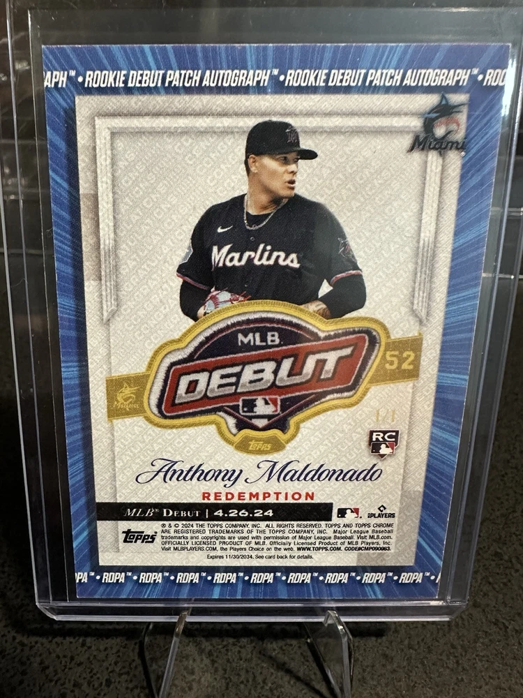 This is a rare and unique 2024 Topps Chrome Update Debut Patch Anthony Maldonado RC Auto 1/1 trading card. It features an autograph and a patch of the Miami Marlins player, Anthony Maldonado, who is a rookie in the Major League (MLB). The card is serial numbered and is a parallel/variety of the 2024 Topps Chrome set. This sports trading card is perfect for collectors who love baseball and want to add a special piece to their collection. It is manufactured by Topps and is authenticated by them. The autograph is hard signed and the memorabilia is a patch. This card is a must-have for any fan of the Miami Marlins or Anthony Maldonado.