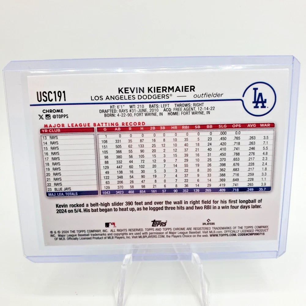 Elevate your baseball card collection with the 2024 Topps Chrome Update Series Purple Refractor #USC191 featuring Kevin Kiermaier of the Los Angeles Dodgers. This limited edition card boasts a print run of just 250, making it a coveted piece for enthusiasts and fans alike. With its striking purple hue and serial numbering, it's a standout representation of Kiermaier's defensive prowess and a must-have for any serious collector. Crafted by Topps, a trusted name in sports memorabilia, this card is part of the esteemed 2024 Topps Chrome Update Series. It not only captures the essence of the game with its base set design but also celebrates the athlete's contribution to Major League Baseball. Whether you're a fan of the sport, a follower of Kiermaier's career, or a connoisseur of rare sports trading cards, this item promises to be a valuable and noteworthy addition to your collection.