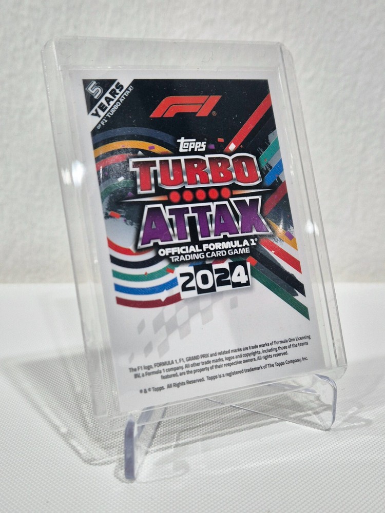 The 2024 Topps F1 Turbo Attax 5 Years Of Anniversary F1 #221 Formula 1 - UK Edition is a sports trading card featuring Formula 1 drivers such as Carlos Sainz, Valteri Bottas, and Lewis Hamilton. Manufactured by Topps in the United Kingdom, this card is part of the 2024 Topps set and is made of card stock with a foil parallel variety. It is a serial numbered card with a chase feature, celebrating 5 years of the Turbo Attax series in the world of Formula 1.