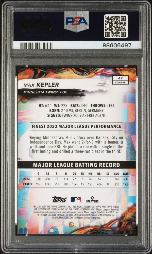 Step into the diamond with this absolutely breathtaking 2024 Topps Finest 47 Max Kepler Blue Checkerboard Ref Blue /99 PSA 10 Gem Mint card. This stunning collectible is an absolute must for any serious card enthusiast or Minnesota Twins fan. The card features Max Kepler, one of the most exciting outfielders in the game, in a dynamic blue checkerboard design that is as visually arresting as it is rare. With only 99 of these cards in existence, this is a truly limited edition card that speaks volumes about the holder's discerning taste and keen eye for exceptional sports memorabilia. Produced by Topps Finest, a brand synonymous with quality and prestige in the sports card industry, this card has been rated PSA 10 Gem Mint. This distinction is reserved for cards that are virtually flawless, offering sharp corners, pristine edges, and brilliantly saturated colors. The card number '47' is a testament to its authenticity and uniqueness, adding to its overall allure. This is not just a sports card; it's a piece of sporting history, a snapshot of Max Kepler's illustrious career, and a tangible connection to the thrilling world of baseball. Whether you're looking to enhance your collection, find the perfect gift for a sports lover, or make a savvy investment in sports memorabilia, this 2024 Topps Finest 47 Max Kepler Blue Checkerboard Ref Blue /99 PSA 10 Gem Mint card delivers on all fronts. Don't miss the opportunity to own this extraordinary piece of sports history.