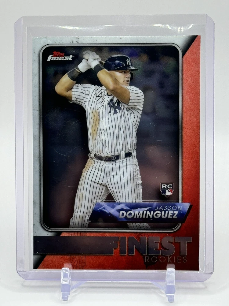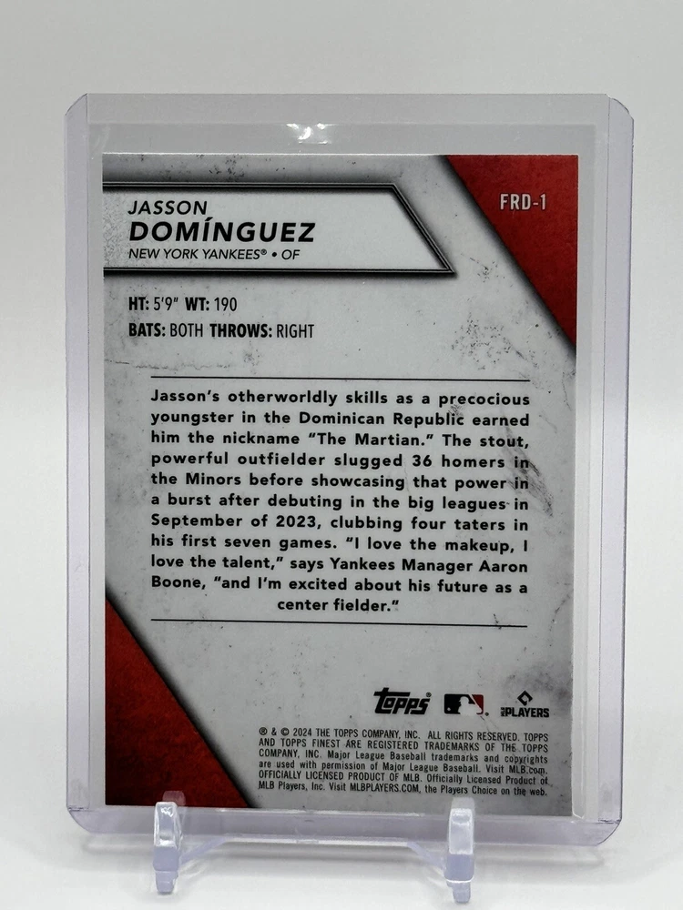 This 2024 Topps Finest #FRD-1 Jasson Dominguez card is a must-have for any Yankees fan or baseball card collector. The card features the young and talented outfielder in his rookie season, making it a valuable addition to any collection. With its crisp design and high-quality printing, this sports trading card is a true gem. It is part of the Finest Rookies insert set and boasts a parallel variety, making it a unique and sought-after item. Whether you're a seasoned collector or just starting out, this card is sure to impress.