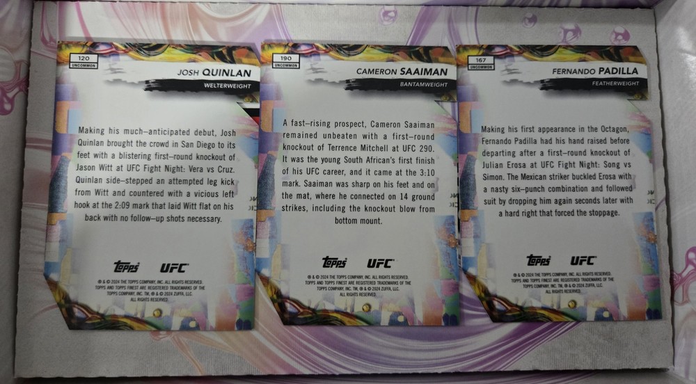 Experience the thrill of the octagon with the 2024 Topps Finest UFC Uncommon Rookie Die-Cut cards, featuring up-and-coming stars Fernando Padilla, Cameron Saaiman, and Josh Quinlan. Each card is a testament to these fighters' potential and is a must-have for fans of Mixed Martial Arts. With the impeccable quality of Topps craftsmanship, these cards are a standout addition to any collection. This exclusive set from the 2024 season is limited to just 35 pieces, adding a level of rarity and desirability. Serial numbered to ensure authenticity, these cards capture the essence of the Ultimate Fighting Championship. Whether you're a seasoned collector or new to the sport, these trading cards are a celebration of the fighter's rookie year and a homage to the legacy of UFC.