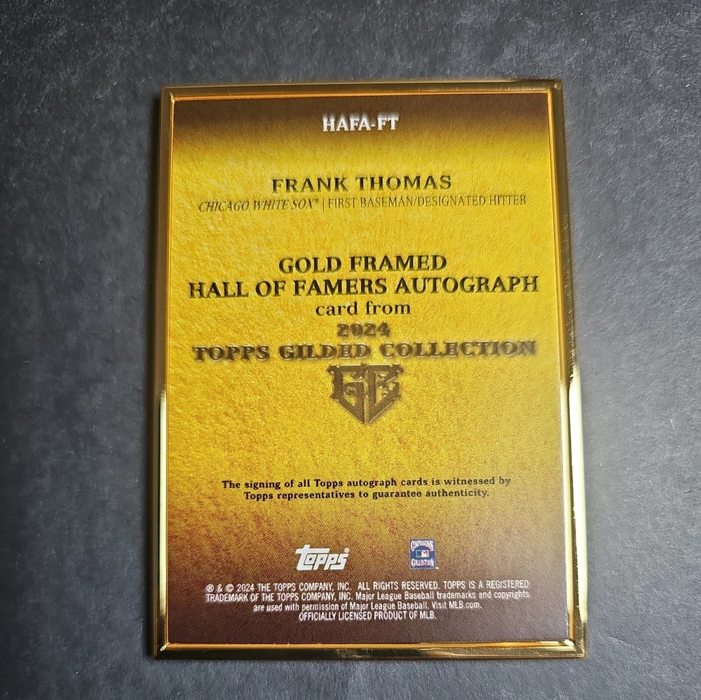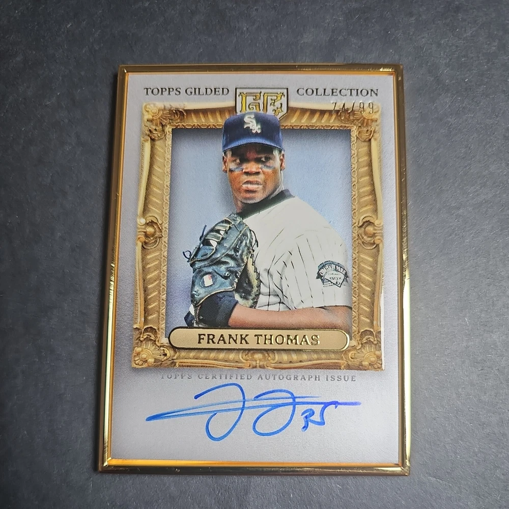 Elevate your collection with the 2024 Topps Gilded Frank Thomas Gold Framed Hall Of Famers Auto card, numbered 74/99. This exquisite piece features the renowned White Sox power hitter, Frank Thomas, and is a must-have for any serious baseball memorabilia enthusiast. The card is part of the highly sought-after 2024 Topps set and boasts an authentic autograph, adding a personal touch from the Hall of Famer himself. Crafted with meticulous attention to detail, the card is presented in a stunning white parallel/variety, framed to enhance its display appeal. Whether you're a fan of Frank Thomas, a follower of Major League Baseball, or a collector of rare sports trading cards, this exclusive item promises to be a standout piece in any collection.