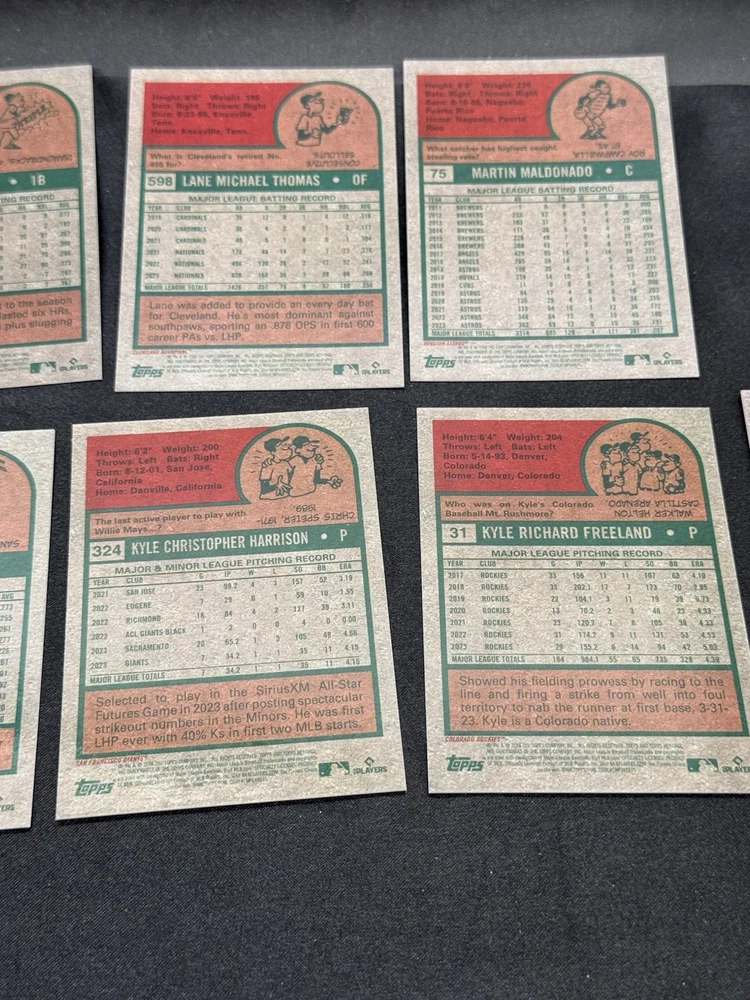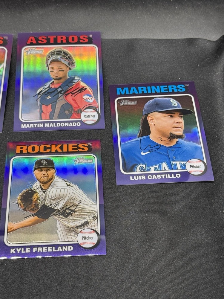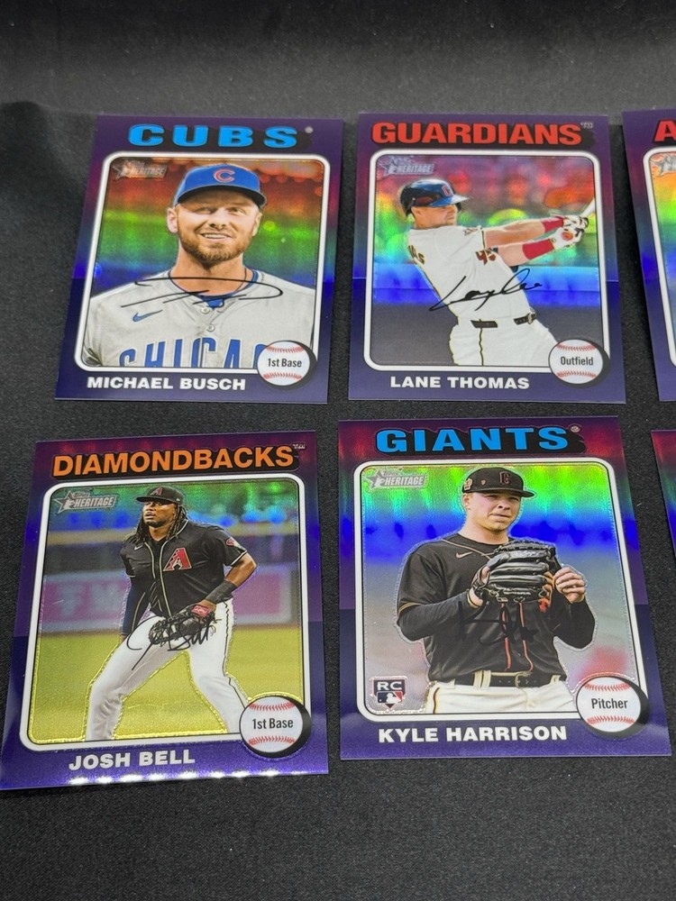 2024 Topps Heritage High Number Purple Chrome Refractor Lot of 7 cards - no duplicates!! You are bidding on the following seven card lot: 31 - Kyle Freeland 75 - Martin Maldonado 324 - Kyle Harrison - RC 449 - Luis Castillo 529 - Josh Bell 537 - Michael Busch 598 - Lane Thomas Thanks for checking out our listings. Please reach out to us if you should have any questions about any of our listings and be sure to check out our other items listed on eBay if you are looking for singles, inserts, lots, etc. from this set or any others - We have plenty of extras of base cards, as well as inserts!! Also, feel free to message us with any questions you might have regarding the photos. Most of our cards were opened from packs and went directly into soft “penny” sleeve and into a hard card (handled with care). Shipping We do offer combined shipping for anyone who purchases more than one item from us. Simply message us when you are finished shopping, and we will send a combined invoice with discounted shipping on it. All cards will be carefully placed inside a soft “penny” sleeve, hard card, team bag, and then between two pieces of cardboard and secured inside a bubbled envelope (unless you pay for eBay Standard envelope). If the items do not fit inside a bubbled envelope, then we will put cards in a plastic case, and ship the items inside a small box using air bags, packing peanuts, bubble wrap, etc. and make sure the item(s) are carefully packaged and secured. If you prefer to save on shipping, we do offer the “eBay standard envelope” shipping rate of $1.15 for cards/items that weigh less than three ounces, and the card(s) price is less than $20 for the card. Be sure to choose the preferred shipping method when you checkout, as we do offer a couple of options for you. If you purchase a complete set, then we will carefully package your item(s) using bubble wrap, air bags, and/or packing peanuts to make sure your item arrives safely. Be sure to check out our feedback messages and see what other buyers are saying about us. All items will carefully ship within 24 hours of receiving confirmed payment. Thanks for checking out our items and we look forward to doing business with you!!