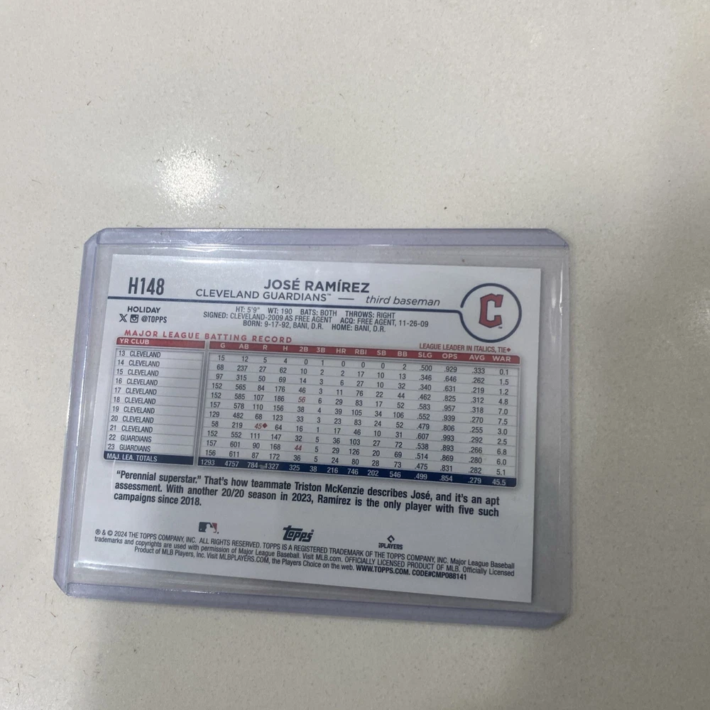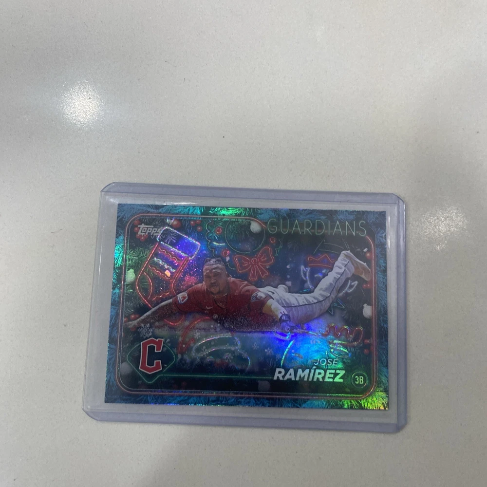 This 2024 Topps Holiday Series sports trading card features Jose Ramirez of the Cleveland Guardians. The card is part of the Holiday Tree Blue Foil parallel/variety and is an original Topps manufacture. It is ungraded and in standard size. The card is a great addition to any Major League Baseball collection and is perfect for fans of the Cleveland Guardians. It is an English language card made in the United States and is not autographed. Get this unique card now and add it to your sports trading card collection!