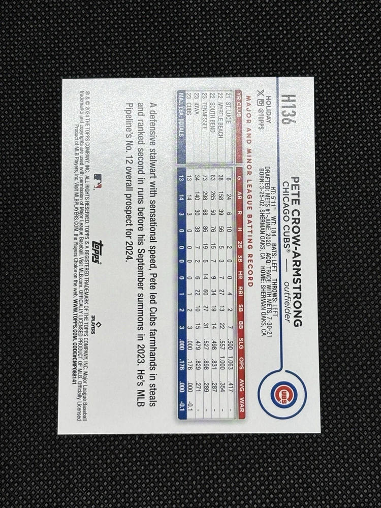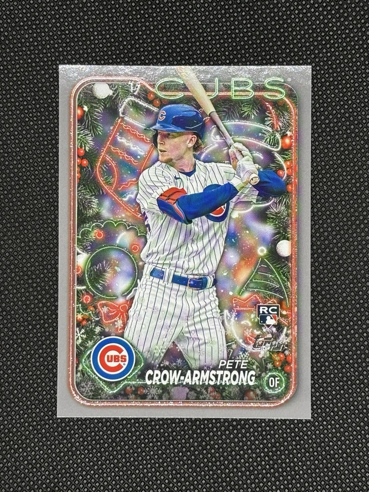 This 2-card set from the 2024 Topps Holiday collection features Pete Crow-Armstrong, a promising young player for the Chicago Cubs in Major League Baseball (MLB). The cards are well-preserved and are in excellent shape, maintaining their original quality since their release. The set includes a base card and a parallel variety card, both of which are ideal for collectors and fans alike. The cards are ungraded and come from the Topps manufacturer, who is known for producing high-quality sports trading cards. This item is a great addition to any collection and is sure to please any baseball enthusiast.