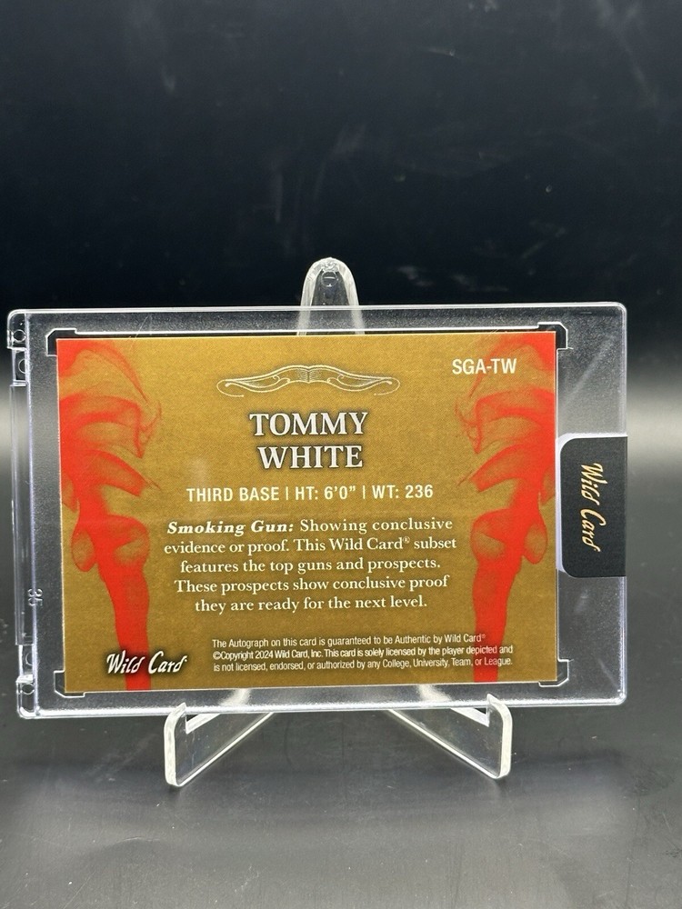 This 2024 Wild Card Sports Trading Card features Tommy White, a rookie player for the Oakland Athletics and LSU Tigers. The card is part of the Smoking Guns HoloLux Orange set and is one of a kind, with a print run of 1/1. It is autographed by White and manufactured by Wild Card. The card has a variety of features, including being serial numbered, a short print, and an insert. It is a Chase card and has a label or sticker autograph format. This card is a great addition to any baseball fan's collection and is in mint condition.