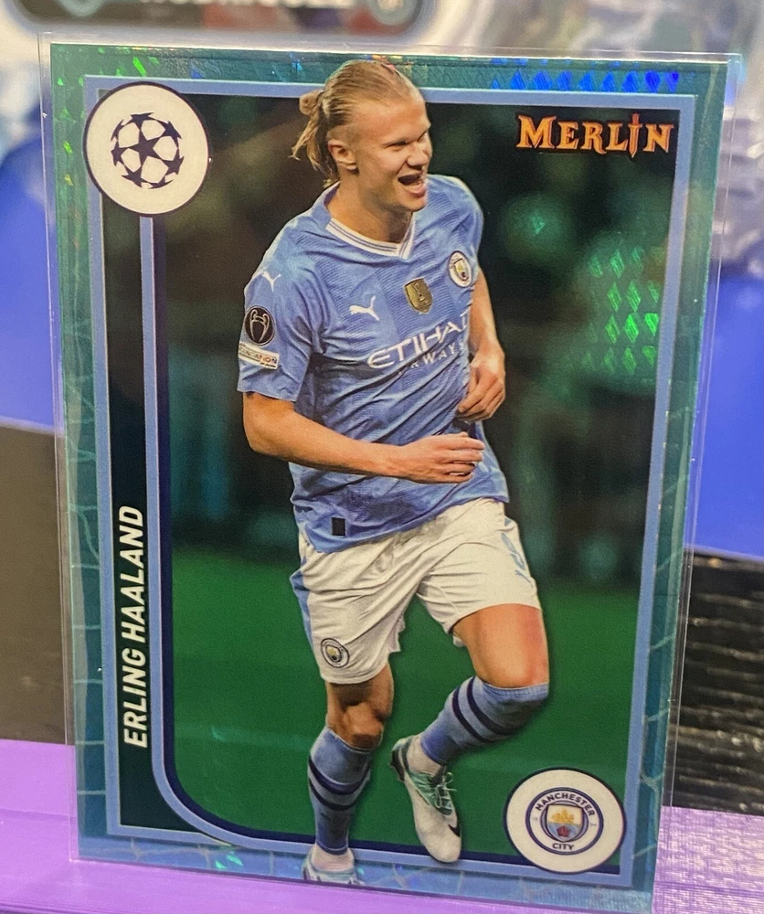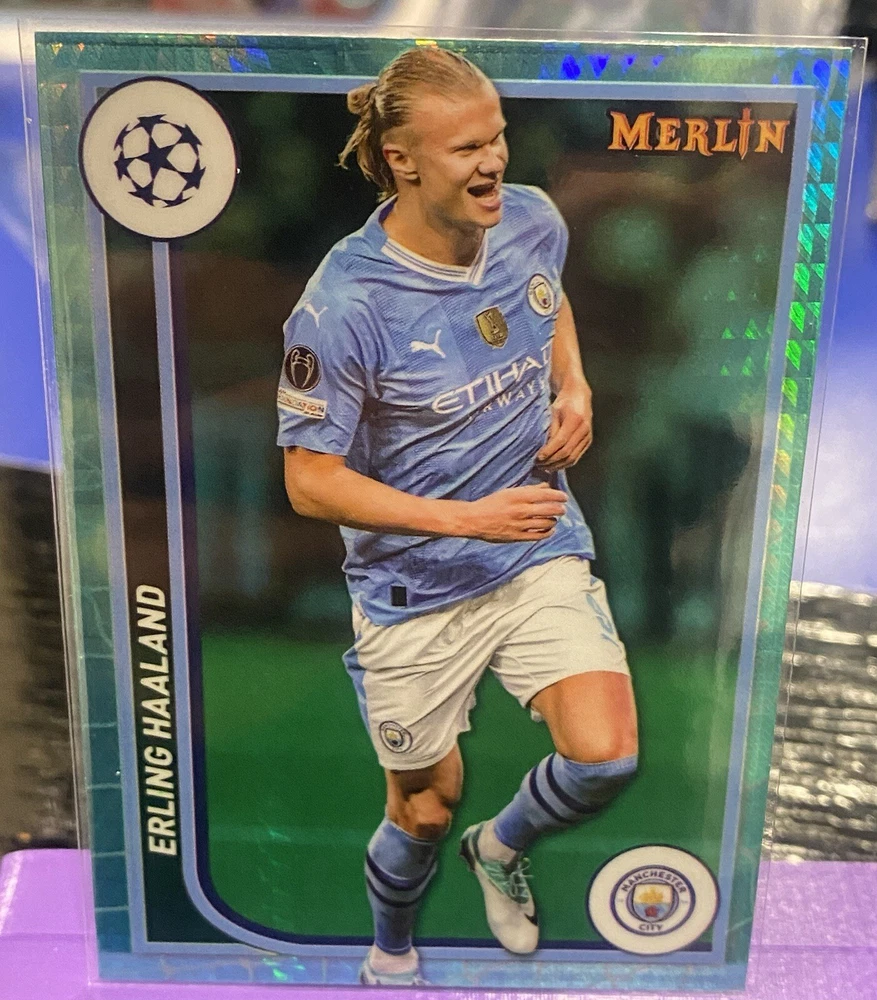Card Size: 3½" x 2½" Character: Erling Haaland Manufacturer: Topps Sport: Soccer Team: Manchester City Franchise: Soccer Card Name: 2024 Topps Merlin Aqua Prism Refractor Erling Haaland Manchester Player/Athlete: Erling Haaland Autographed: No Year Manufactured: 2024 Parallel/Variety: Aqua Refractor Card Number: 73 Vintage: No Season: 2024 Type: Sports Trading Card Game: Pro Footballer Original/Licensed Reprint: Original League: Premier League, UEFA Champions League Set: Topps 2023/24 Merlins Gamers