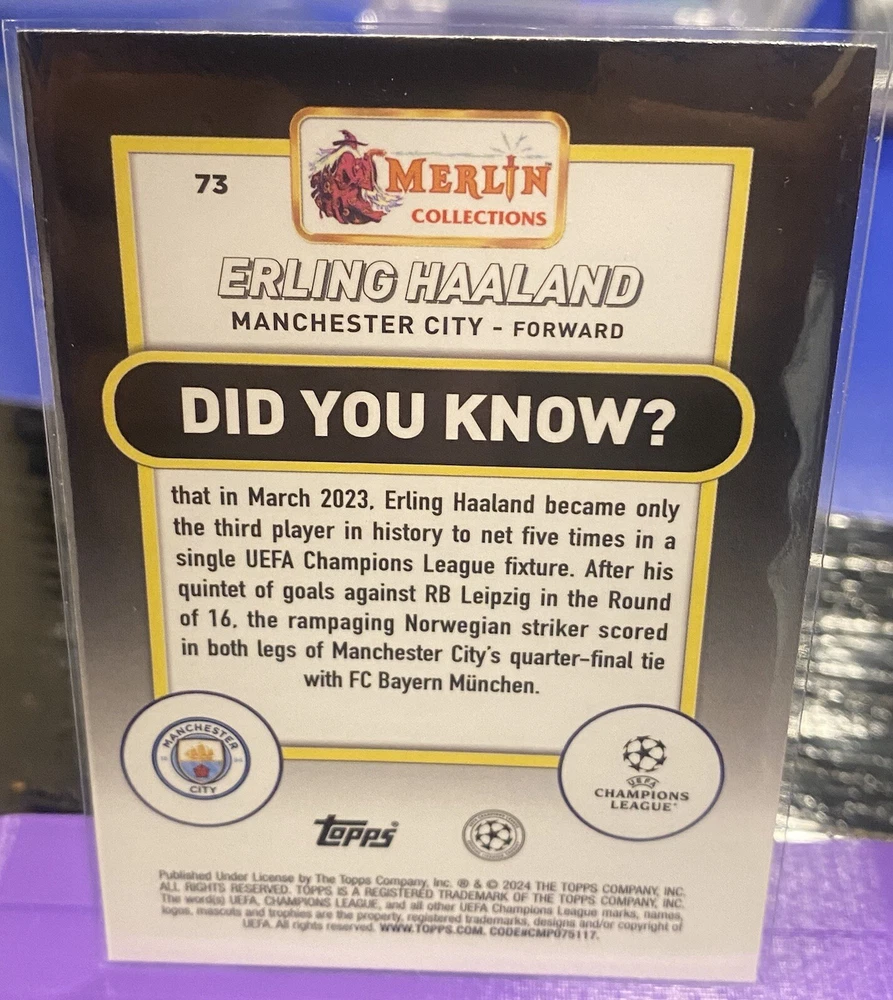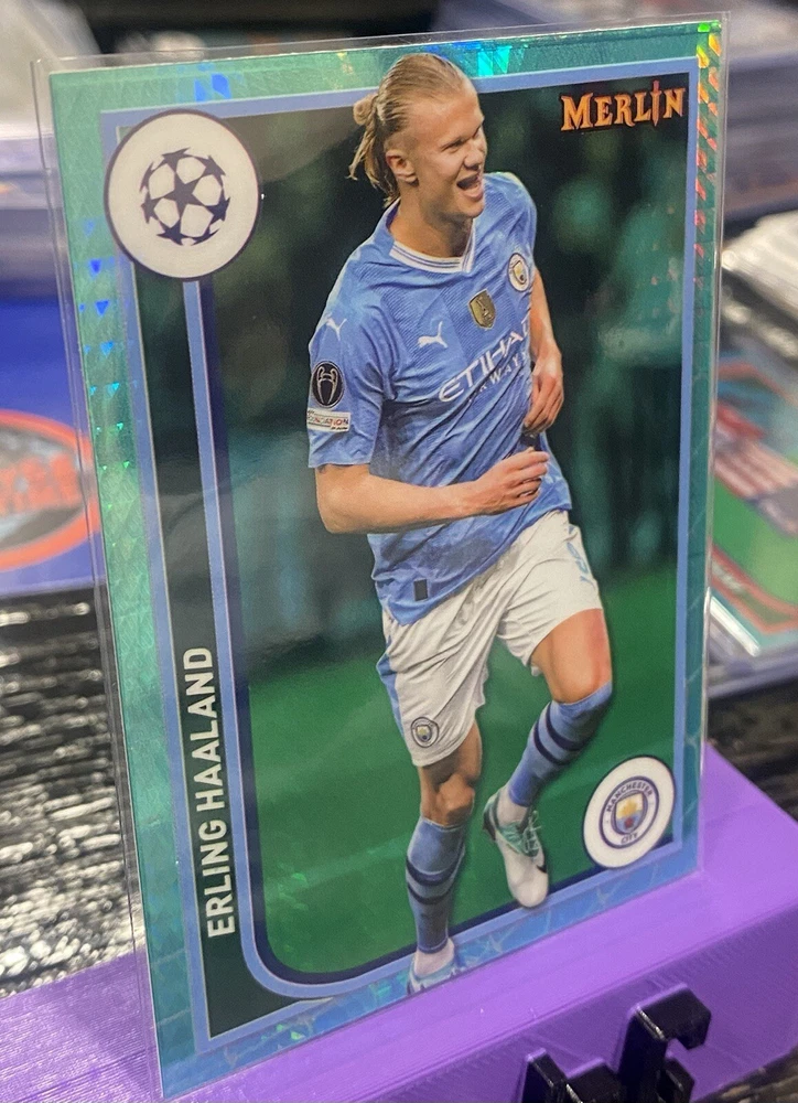 Just ripped from Merlins Gamers box! Get this Aqua Refractor Prism from Topps 2024! Haaland is one of the most dominant footballers in todays game! This card states he became the third player in history to net five times in a single UEFA champions league fixture ! With this purchase some extra random cards will be inserted into your shipment for the spooky season 👻✅🔥