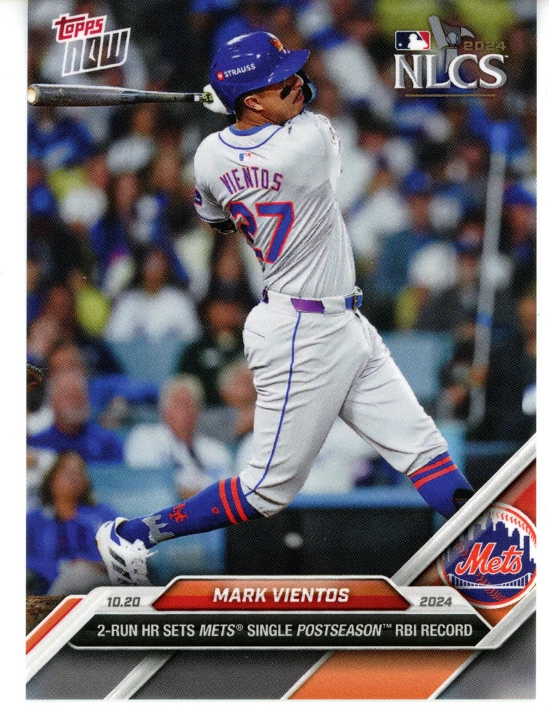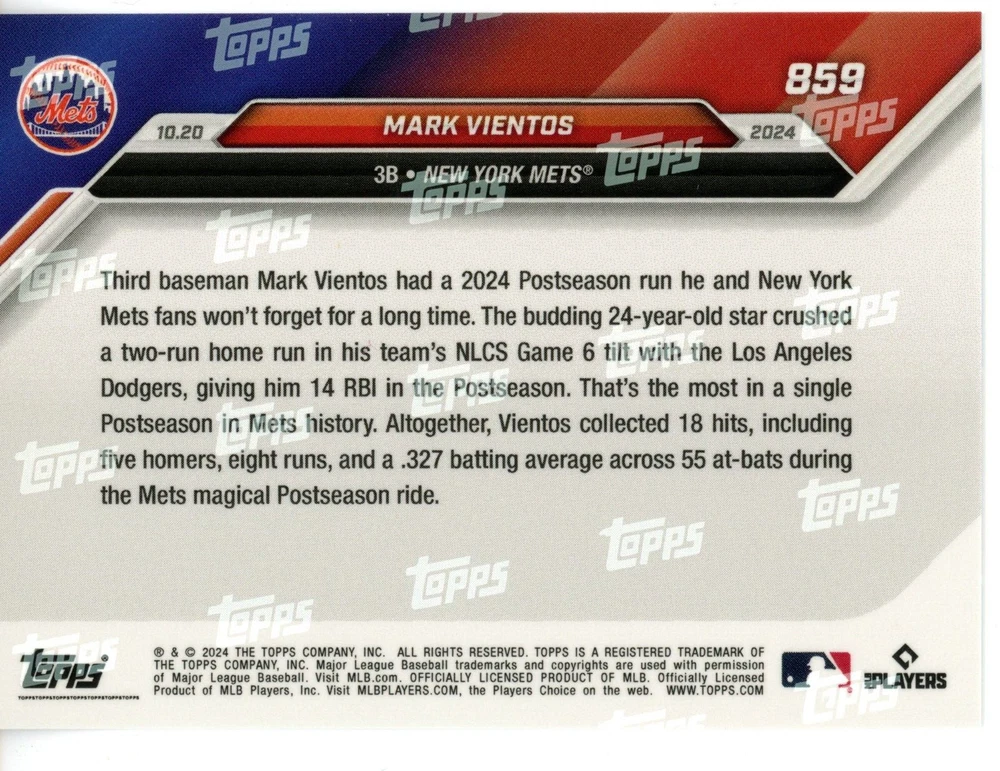 For sale is the 2024 Topps Now #859 card commemorating Mark Vientos’s remarkable achievement, setting the Mets' single postseason RBI record. This card, with a limited print run, is a great addition for any Mets fan or collector of historic playoff moments. Card Details: Player: Mark Vientos Team: New York Mets Set: 2024 Topps Now Card Title: "2-Run Sets Mets Single Postseason RBI Record" Card Number: #859 Print Run: 1,736 Description: This collectible card captures the highlight of Vientos’s postseason performance, setting a new franchise RBI record with a clutch 2-run hit. Limited to a print run of 1,736, it’s a memorable piece of Mets history. Secure this limited-edition card for your collection today!
