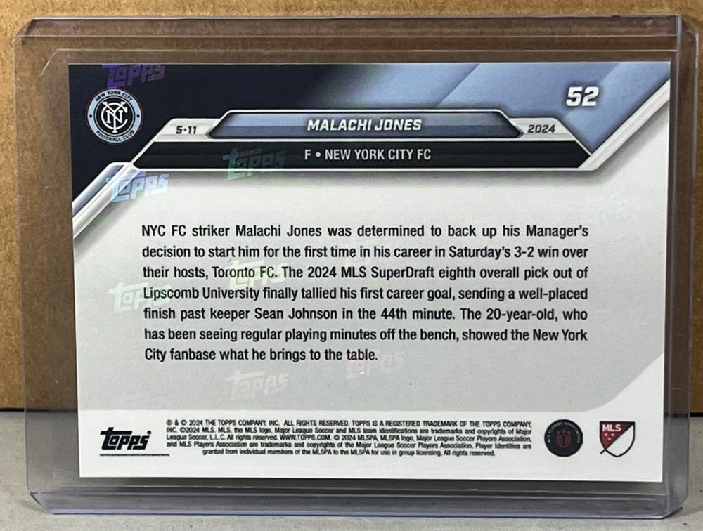 2024 TOPPS NOW MLS #52 MALACHI JONES NEW YORK CITY FC Call-Up 2024 Superdraft pick logs 1st career MLS goal. Orange parallel serial #'d 5/5. The Jones pictured is the actual one you will receive. Worldwide shipping available. U.S. - Winning bidder to add $3.99 for careful USPS first class shipping with delivery confirmation. Add .50 for each additional item. All other countries - ship costs are calculated by eBay through international shipping program. Please message if interested in multiple items. Bid with confidence, 49000+ feedback. Thanks and check out my auctions ending every Sunday. Please note that combined ship rates are for items paid for on one invoice, thanks!