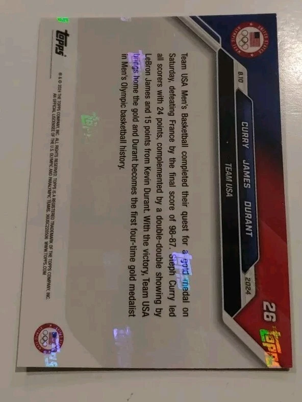 Own a piece of history with this 2024 Topps Now Olympic Games sports trading card featuring three of the greatest athletes of our time - LeBron James, Steph Curry, and Kevin Durant. This card showcases the USA team in the 2024 Olympic Games, making it a must-have for any sports fan or collector. With its sleek design and high-quality manufacturing by Topps, this card is a true gem. It is not autographed, but the stunning images of the athletes in action make it a valuable addition to any collection. Don't miss out on the chance to own this unique piece of sports memorabilia.