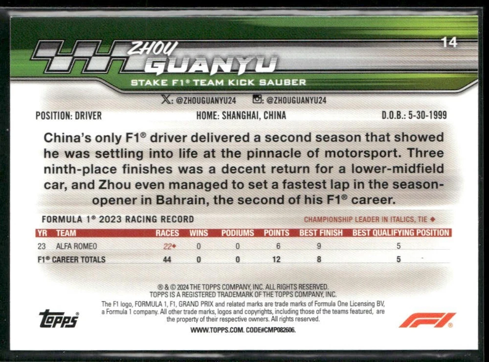 Up for sale is a 2024 Topps Paddock Pass Formula 1 #14 Zhou Guanyu Stake F1 Team Kick Sauber card. This card spotlights Zhou Guanyu’s continued journey in Formula 1 and reflects the evolving partnership between the Sauber organization and its new sponsors. If you’re a fan of Zhou or you love keeping track of new sponsorships in motorsport, this card offers a unique slice of F1 memorabilia. Card Details Driver: Zhou Guanyu Team (as printed): Stake F1 Team Kick Sauber Set: 2024 Topps Paddock Pass Formula 1 Card Number: #14 About the Driver Zhou Guanyu is recognized as the first full-time Chinese driver in Formula 1. He has demonstrated solid pace and maturity on track since his debut, quickly earning attention from fans and the F1 community. Partnering with the Sauber organization (under new sponsorship details), Zhou aims to continue improving results and pushing the team forward in the 2024 season. Card Significance This officially licensed Topps card captures the evolving story of both Zhou Guanyu’s career and the Sauber-based team’s sponsorship changes. Perfect for dedicated F1 collectors or those intrigued by the business side of motorsports, this collectible is a snapshot of a significant transitional period in Formula 1. Thank you for looking, and happy collecting!