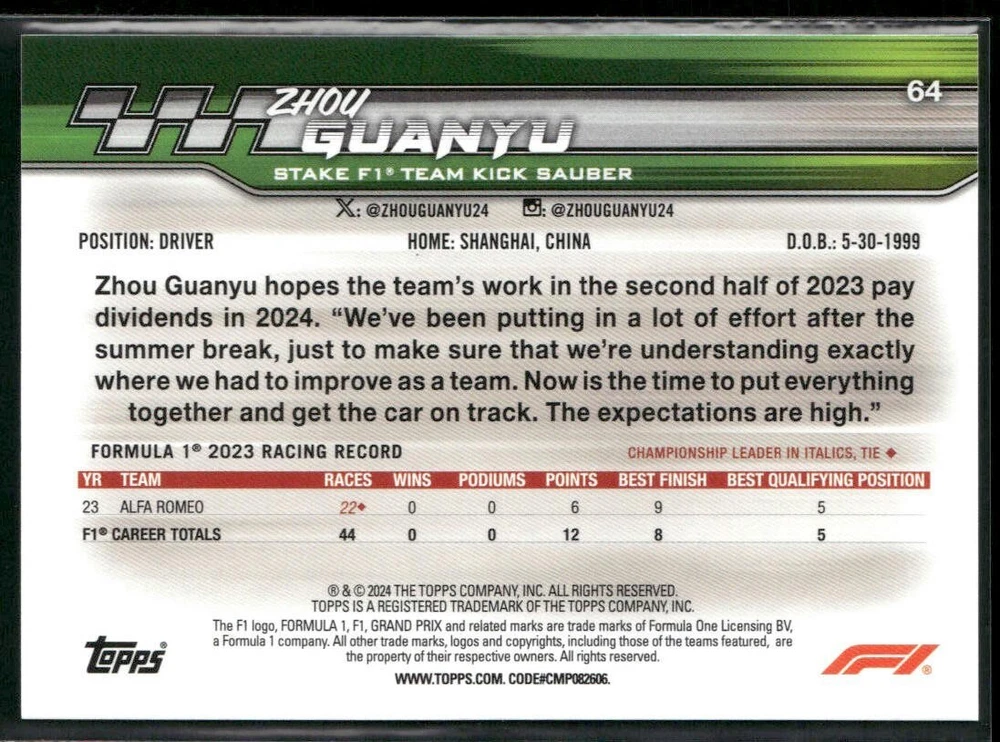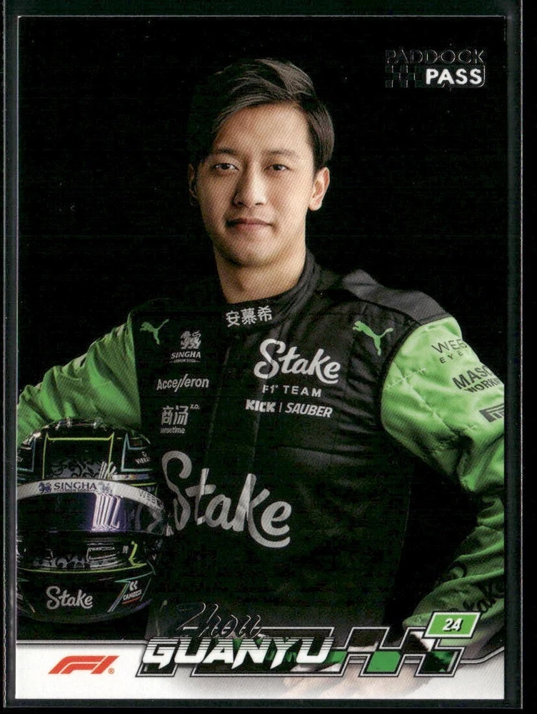 Up for sale is a 2024 Topps Paddock Pass Formula 1 #64 Zhou Guanyu Sauber F1 Team card. This card features Zhou Guanyu’s continued journey in Formula 1 under the Sauber umbrella, a key transition year as the team moves beyond its Alfa Romeo title sponsorship. A rising talent on the grid, Zhou pairs his consistency and determination with Sauber’s storied background in F1. Card Details Driver: Zhou Guanyu Team: Sauber F1 Team (2024 projected name) Set: 2024 Topps Paddock Pass Formula 1 Card Number: #64 About the Driver Zhou Guanyu made history as the first full-time Chinese driver in Formula 1. Known for his smooth style and steady racecraft, he’s quickly become a fan favorite. As he develops under the Sauber organization, Zhou aims to climb the ranks and secure strong points finishes throughout the 2024 season. Card Significance This officially licensed card from Topps is an excellent piece for collectors and Formula 1 enthusiasts looking to document the evolution of the Sauber team and Zhou’s promising career. Whether you’re expanding an existing F1 collection or just starting out, this card captures an exciting chapter in motorsport history. Thank you for looking, and happy collecting!