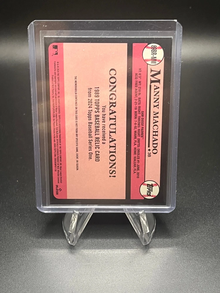 Capture a piece of baseball history with the 2024 Topps Series 1-35TH Anniversary-MANNY MACHADO BAT RELIC #88BR-MM. This sports trading card features a relic from the bat of Manny Machado, one of the San Diego Padres' most notable players. It's a unique memorabilia card that brings fans closer to the game. The card is part of the 2024 Topps Series 1 set and celebrates the Major Leagues with style. While it doesn't include an autograph, the relic piece makes it a standout collectible. Proudly display your passion for the sport and your support for the Padres with this original, non-autographed treasure.