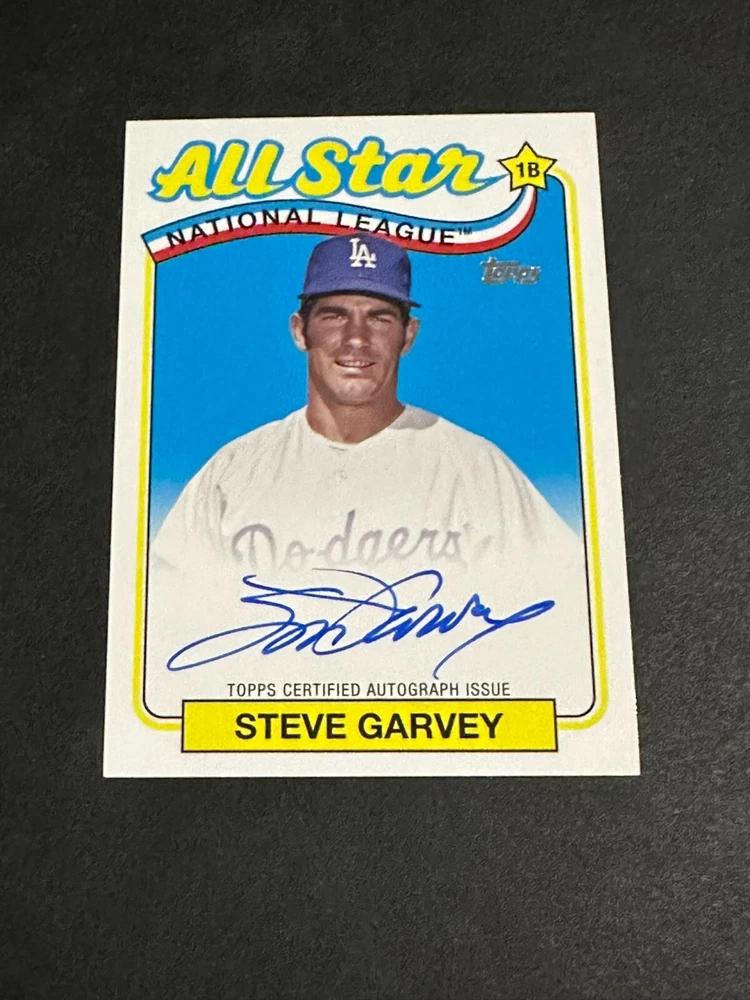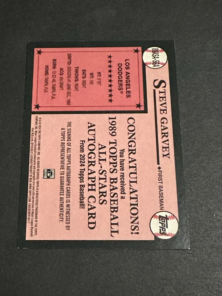 This 2024 Topps Series 2 Steve Garvey trading card is a must-have for any Los Angeles Dodgers fan or baseball card collector. The card features an autograph from the former major league baseball player and is part of the 1989 Topps Baseball All-Star Autographs insert set. The card is in near mint or better condition and has been authenticated by Topps. It is an original card manufactured in the United States in 2024 and is part of the sports trading card category. The card number is 89ASA-SGA and it is a hard signed autograph format. Don't miss out on the opportunity to add this rare and valuable card to your collection.