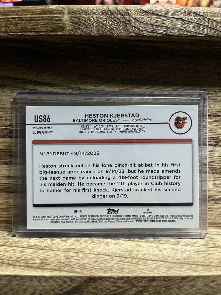 Team:Baltimore OriolesCard Number:394Features:Rookie, Base SetSet:2024 Topps Series 2Autographed:NoCountry/Region of Manufacture:United StatesPlayer/Athlete:Heston KjerstadSeason:2024Parallel/Variety:[Base]Year Manufactured:2024Sport:BaseballOriginal/Licensed Reprint:OriginalMaterial:Card StockVintage:NoEvent/Tournament:MLB World SeriesLeague:Major League Baseball (MLB)Card Thickness:20 Pt.Manufacturer:ToppsType:Sports Trading Card