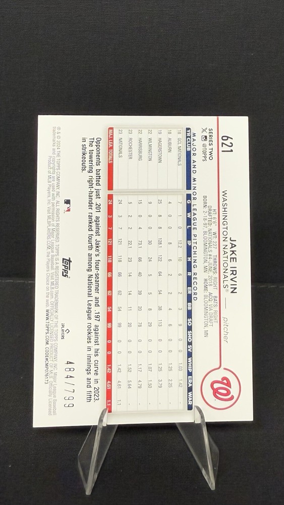 The item is a 2024 Topps Series 2 trading card featuring Jake Irvin, numbered 621. It has a purple foil design and is limited to 799 copies. The card is in near mint condition or better.