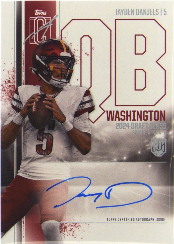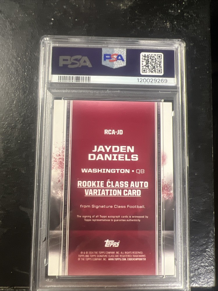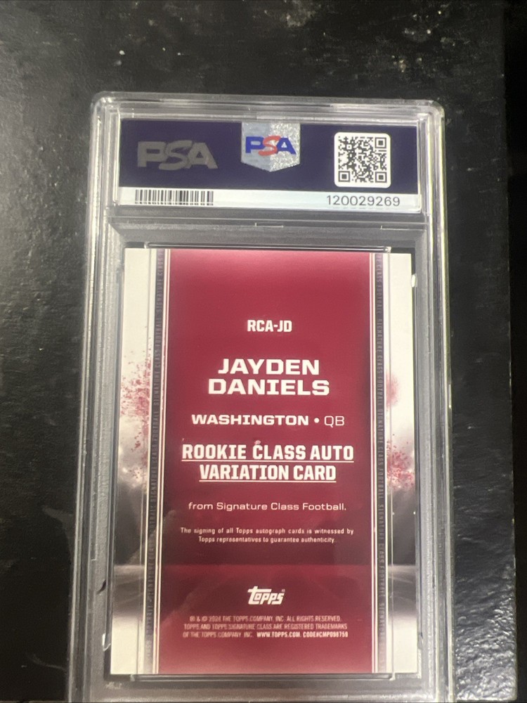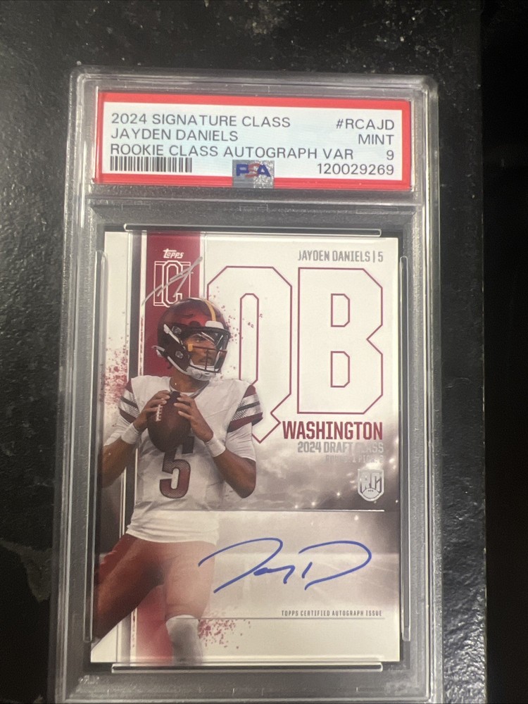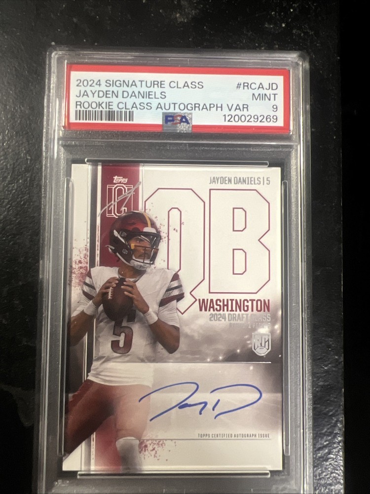 The 2024 Topps Signature Class Rookie Class Auto featuring Jayden Daniels #RCA-JD is a highly coveted sports trading card for football enthusiasts. This autographed card from the National Football League (NFL) showcases a promising rookie player from the Washington Commanders. Graded a 9 by Professional Sports Authenticator (PSA), this limited edition card is part of the Rookie Class Autographs insert set, making it a valuable addition to any football card collection. With its exclusive features and top-notch manufacture by Topps, this card embodies the excitement and prestige of the sport of football in the 2024 season.