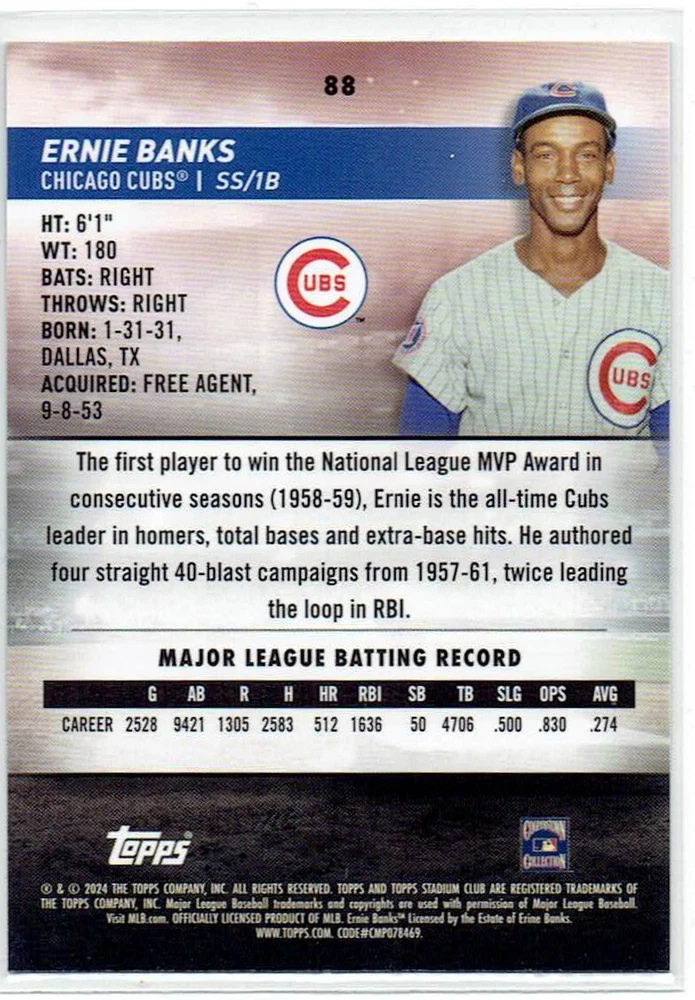 Capture the spirit of America's favorite pastime with the 2024 Topps Stadium Club Ernie Banks #88 card. This collector's item features the legendary Chicago Cubs shortstop and celebrates his impact on the game of baseball. The card is part of the esteemed 2024 Topps Stadium Club Base Set, showcasing the exceptional quality and design Topps is known for.For fans of Major League Baseball and sports memorabilia, this card is a must-have. It's a tribute to the athlete's legacy and an emblem of the sport's rich history. Whether you're a dedicated follower of Ernie Banks's storied career or a connoisseur of fine sports collectibles, this card captures the essence of both the player and the game.
