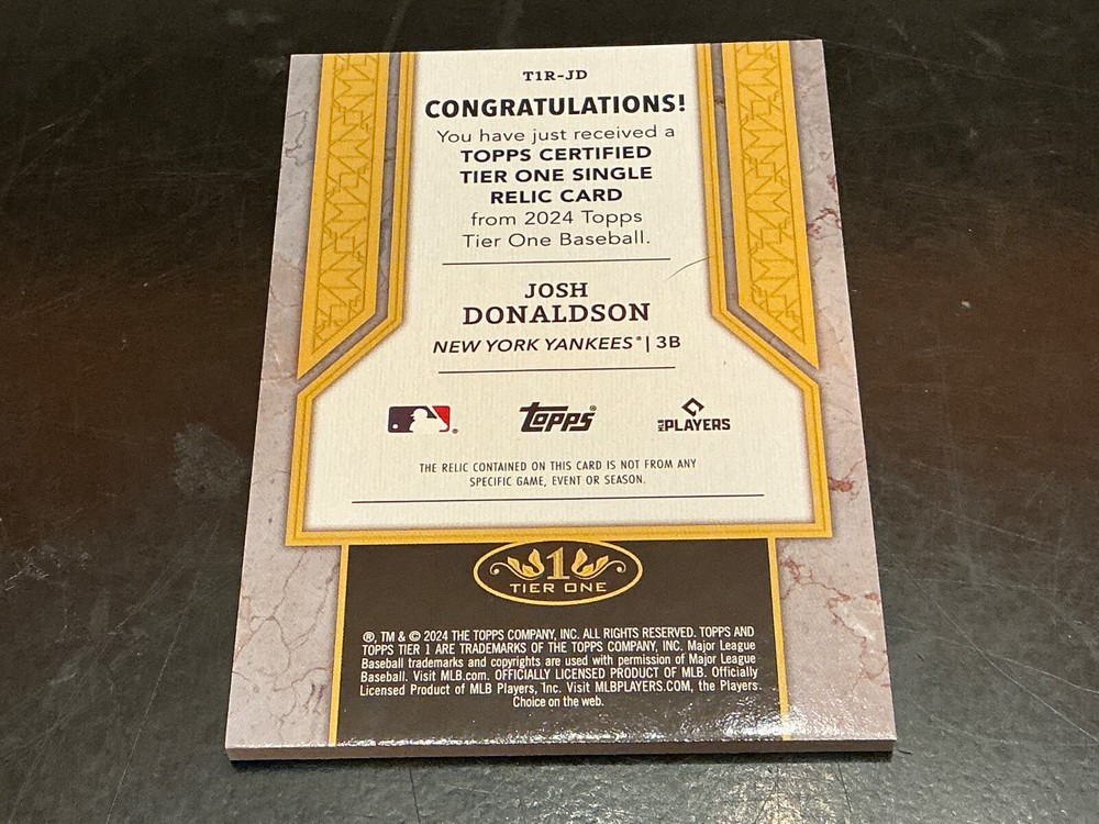This is a 2024 Topps Tier One trading card featuring baseball player Josh Donaldson from the New York Yankees. The card is part of the Tier One Relics insert set and includes a piece of memorabilia from the player. It is serial numbered out of 199 copies and manufactured by Topps for Major League Baseball (MLB) fans and sports trading card collectors.