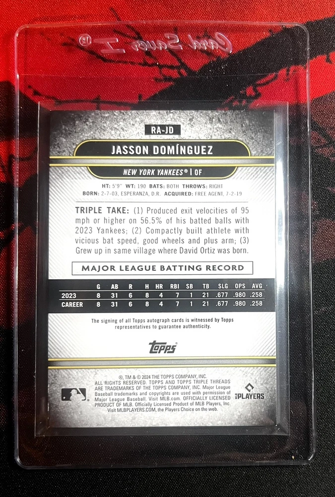 The product is a 2024 Topps Triple Threads trading card featuring Jasson Dominguez, a rookie player for the New York Yankees in Major League Baseball. This autographed card is limited to just 99 copies and is part of a sports trading card set manufactured by Topps. The card is a valuable collectible for fans and collectors of baseball memorabilia, specifically those interested in the promising young talent of Jasson Dominguez.
