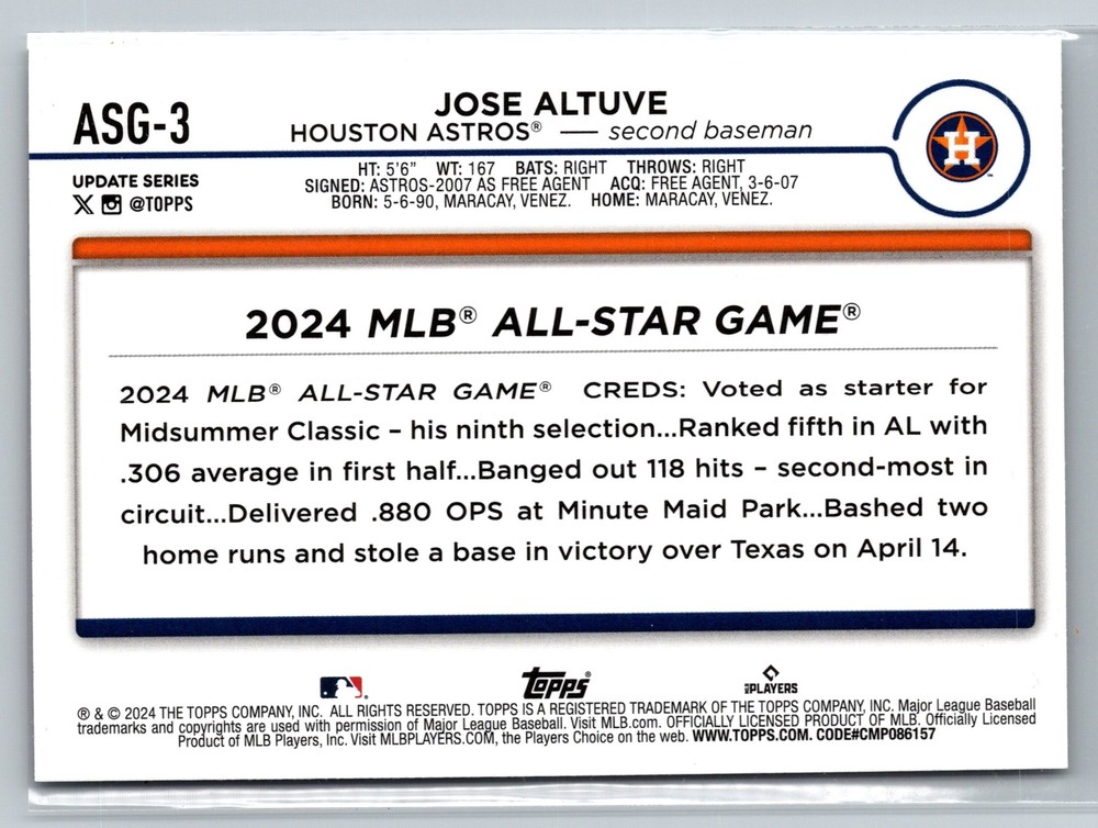 This is a nice example of a 2024 Topps Update #ASG-3 Jose Altuve 2024 All-Star Game. Other important information about this card: In 2024 Jose Altuve played for the Houston Astros. Please check out our other listings for more great cards. Lot:23