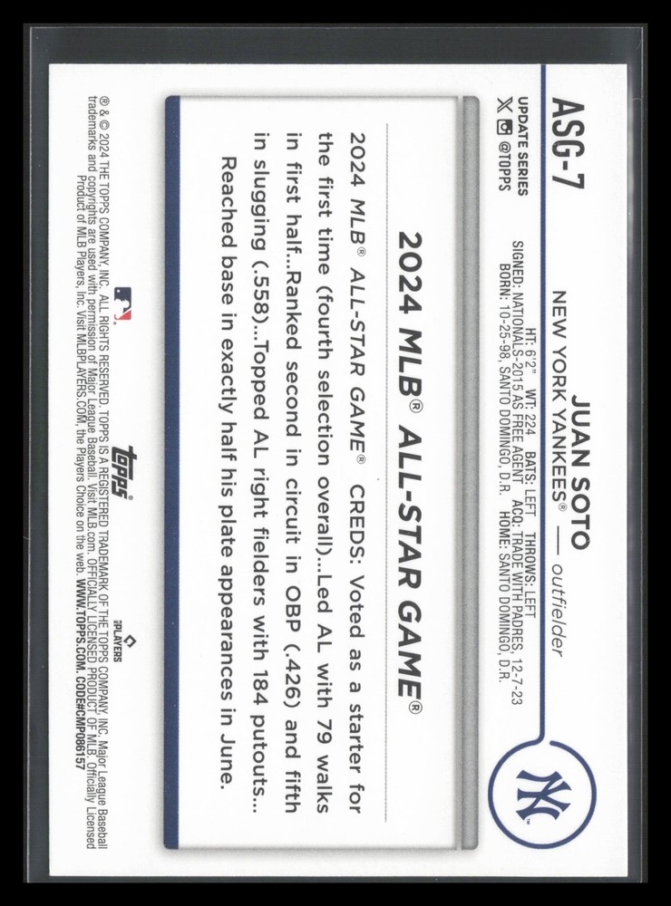2024 Topps Update Juan Soto Cards typically ship each morning around 5 am. I offer the following shipping services: ebay standard envelope: this is put in a semi rigid card holder with a piece of blue painters tape sealing it and in a plain white envelope with tracking. This is typically for cheaper cards ($20 or less). This service may not be available for thicker cards. USPS First Class: this is put in a top loader, then into a team bag with a piece of card board in it as well. Then shipped in a bubble mailer with tracking. This is for individuals that do not like the idea of the plain white envelope or for cards $20-100. USPS Priority Small Flat Rate Box: this is put into a top loader, then into a priority bubble mailer, then lastly into a flat rate priority box with tracking. Ideally for cards priced over $100. Please check my store as I combine shipping.
