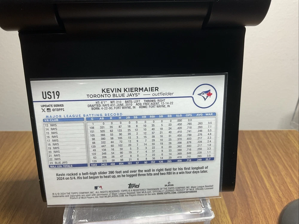 Set: 2024 Topps Language: English League: Major League (MLB) Country/Region of Manufacture: United States Team: Toronto Blue Jays Player/Athlete: Kevin Kiermaier Sport: Baseball Card Number: US19 Season: 2024 Autographed: No Manufacturer: Topps Card Size: Standard Year Manufactured: 2024 Type: Sports Trading Card Vintage: No