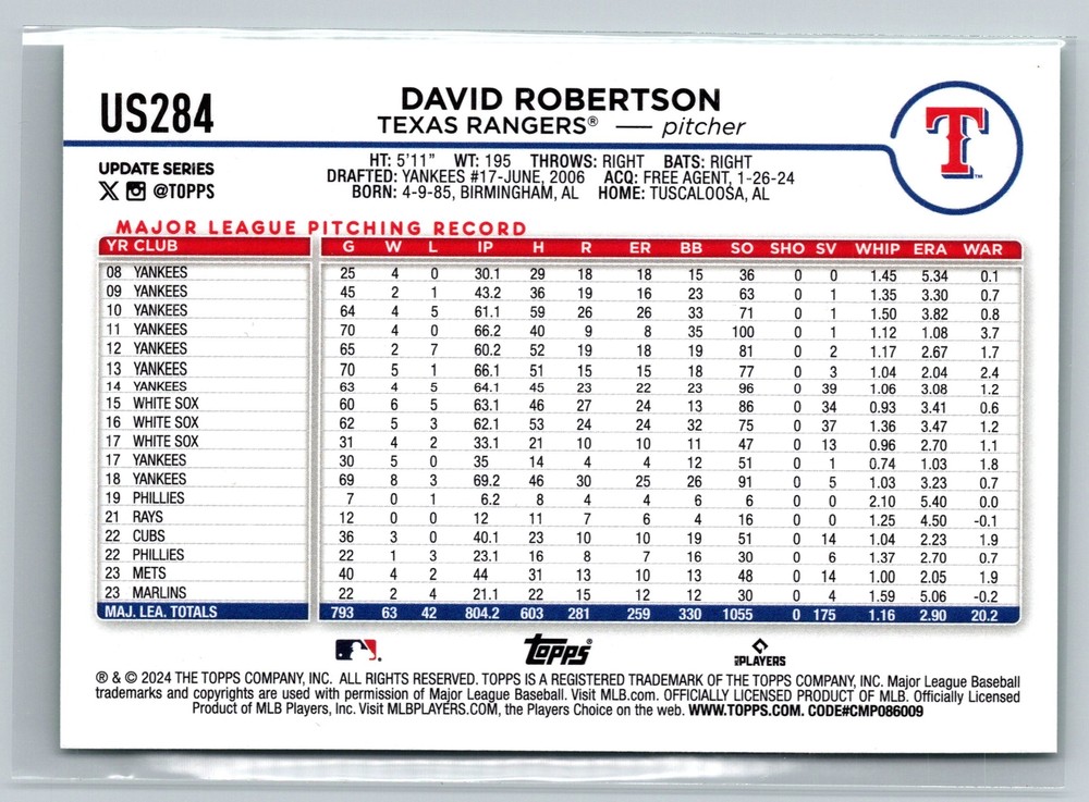 This is a nice example of a 2024 Topps Update #US284 David Robertson Aqua. Other important information about this card: In 2024 David Robertson played for the Texas Rangers. Please check out our other listings for more great cards. Lot:23