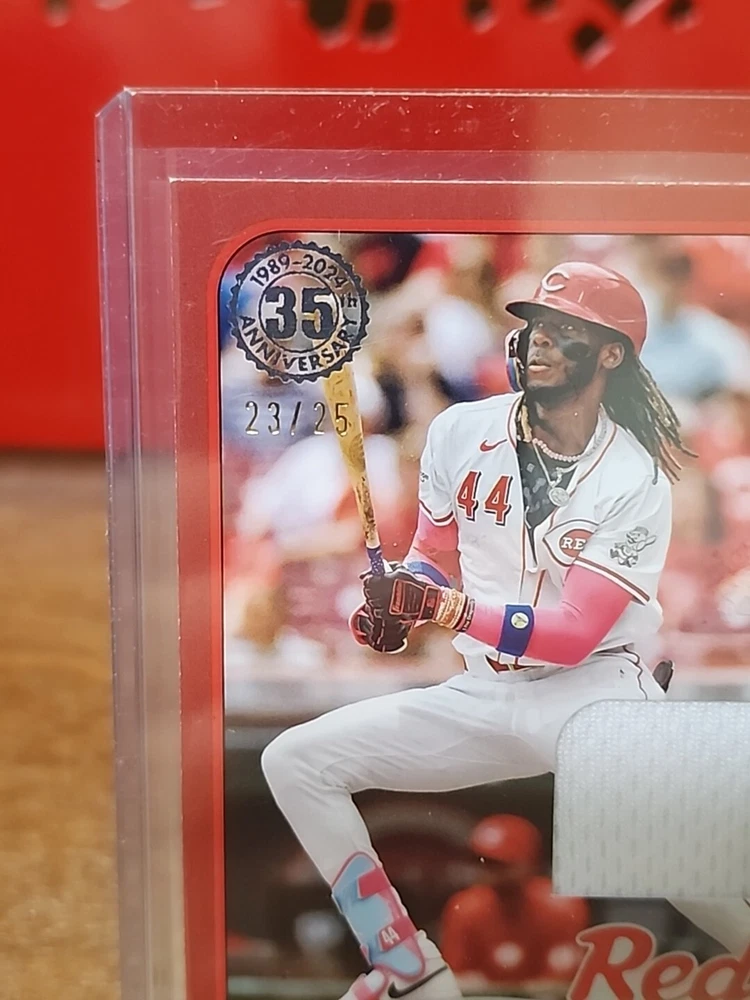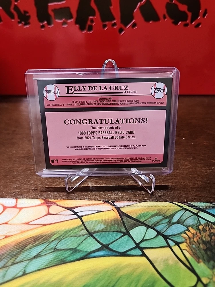 This 2024 Topps Update Series trading card features Elly De La Cruz of the Cincinnati Reds. The card is a 1989 Topps Baseball Relics card, with a print run of only 25. It is a great addition to any baseball card collection, especially for fans of the Major League (MLB). The card is ungraded and has not been autographed. It is a memorabilia card, with features including being a rookie card and having a relic attached. The card was manufactured by Topps in 2024 and is part of the Sports Trading Card category. It is a must-have for any collector or fan of baseball.