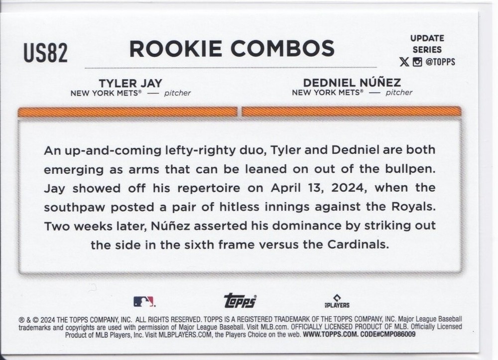 Sport: Baseball Player/Athlete: Dedniel Nunez, Tyler Jay Card Number: US82 Team: New York Mets Season: 2024 Manufacturer: Topps Features: Rookie, Base Set, Parallel/Variety Parallel/Variety: Rainbow Foil League: Major League Baseball (MLB) Type: Sports Trading Card Set: 2024 Topps Update Series