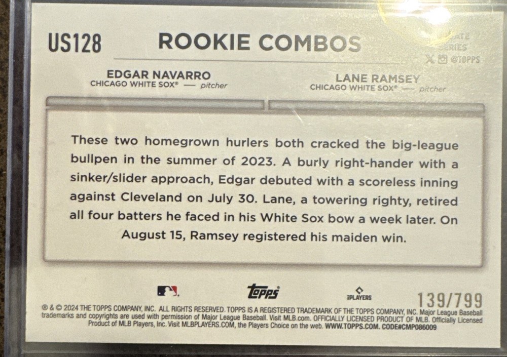 The 2024 Topps Update Series Rookie Combo #US128 features Edgar Navarro and Lane Ramsey of the Chicago White Sox. This limited edition trading card has a purple parallel variety with a print run 139 of 799. Manufactured by Topps, the card is in near mint or better condition and is a rookie card from the 2024 baseball season.