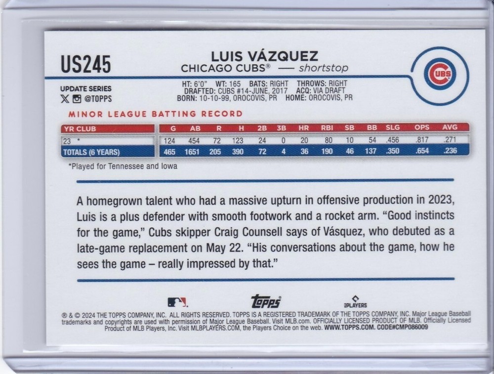 Elevate your baseball card collection with the 2024 Topps Update Series Silver Crackle Foilboard card featuring up-and-coming star Luis Vazquez of the Chicago Cubs. Card #US245 captures the essence of Vazquez's rookie season, making it a must-have for fans and collectors alike.The card boasts an eye-catching silver crackle foilboard design, adding a unique touch to the base set. As a part of the esteemed Major League Baseball series by Topps, this card is a standout piece representing the sport and the promising talent of Luis Vazquez.