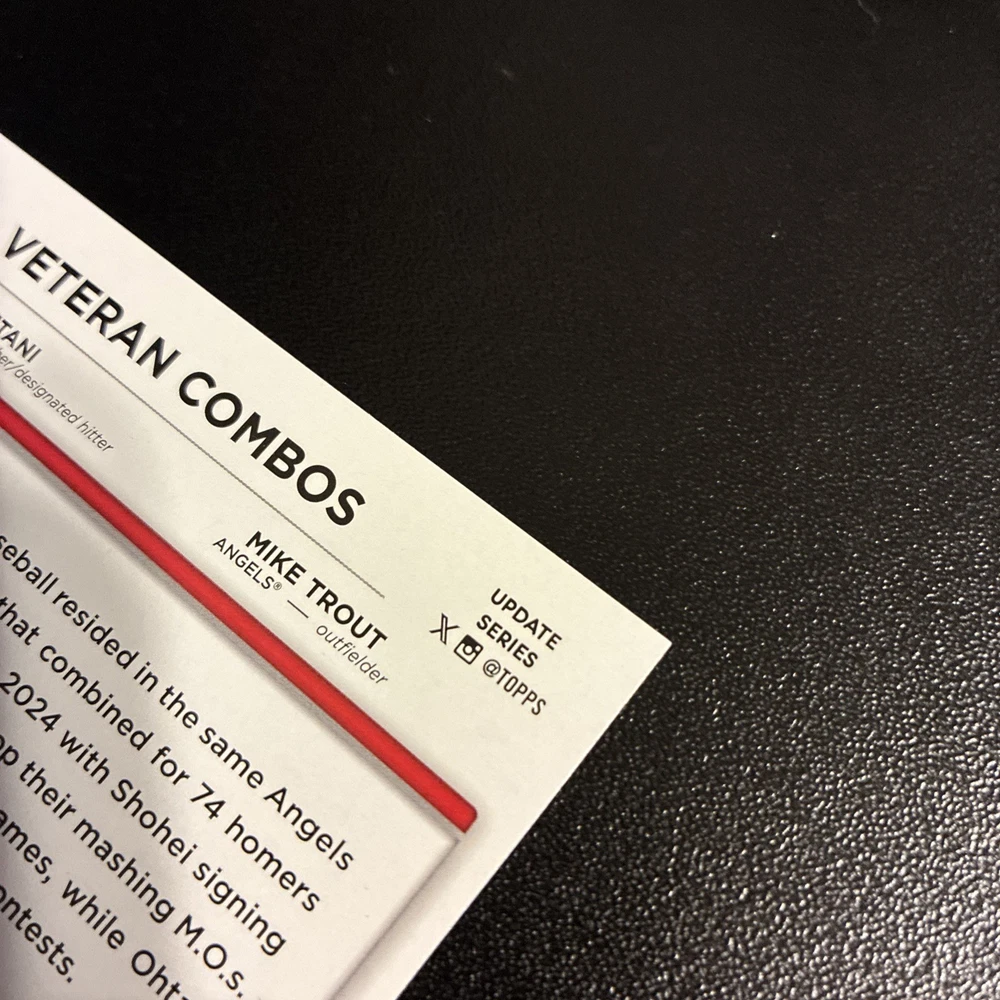 Team:Los Angeles Angels, Los Angeles DodgersParallel/Variety:Ghost Foilbrand:ToppsSubset:Veteran CombosSport:BaseballCard Number:US76League:Major League Baseball (MLB)Series:Topps Update SeriesAdditional Description:Veteran Combos - How You Been? (Ex-Mates Become Solo Acts)Season:2024Set:2024 Topps Update SeriesPlayer/Athlete:Mike Trout, Shohei OhtaniFeatures:Base Set, Parallel/VarietyManufacturer:Topps