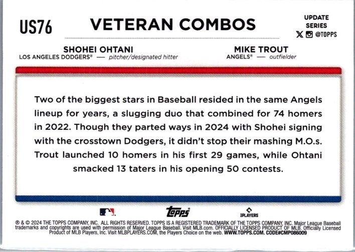 Step up to the plate with this 2024 Topps Update Series card featuring a dynamic duo from Major League Baseball. The card #US76 showcases the talent of Los Angeles Angels' Shohei Ohtani and Mike Trout, capturing their synergy on the field. This base set card is a must-have for any baseball enthusiast looking to add a piece of MLB history to their collection. Crafted by the renowned manufacturer Topps, this sports trading card is part of a series that celebrates the most exciting players and moments from the 2024 season. Whether you're a fan of the Angels, the Dodgers, or just the game itself, this card is a fantastic way to honor the legacy of these legendary athletes.