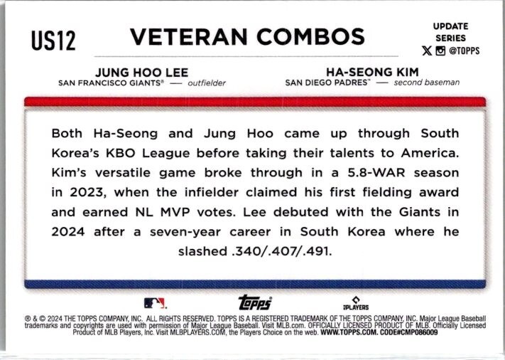Step up to the plate with the 2024 Topps Update Veteran Combos #US12 card, featuring the dynamic duo of Ha-Seong Kim and Jung-Hoo Lee. This eye-catching yellow parallel/variety card brings together the San Francisco Giants and the San Diego Padres in a display of baseball synergy. Crafted with precision by Topps, this card belongs to the esteemed 2024 Topps Update Series and is a must-have for collectors and fans alike. With its inclusion in the base set, this trading card captures the essence of Major League Baseball and is a tribute to the skill and spirit of the players.