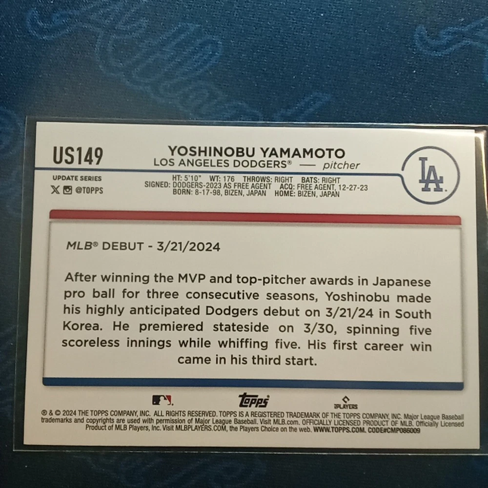 Capture the excitement of the diamond with the 2024 Topps Update Yoshinobu Yamamoto RC Rookie Debut Royal Blue US149 card. This collector's gem features the rising star on the Los Angeles Dodgers roster, celebrating his impactful entry into the big leagues. The card, part of the renowned Royal Blue insert set, is a must-have for baseball aficionados and fans of the sport. With its vibrant design and crisp imagery, the card stands out as a symbol of Yamamoto's potential and the Dodgers' legacy. Manufactured by Topps, a trusted name in sports trading cards, this piece of memorabilia is a tribute to the 2024 MLB season and the promising talent of Yoshinobu Yamamoto.