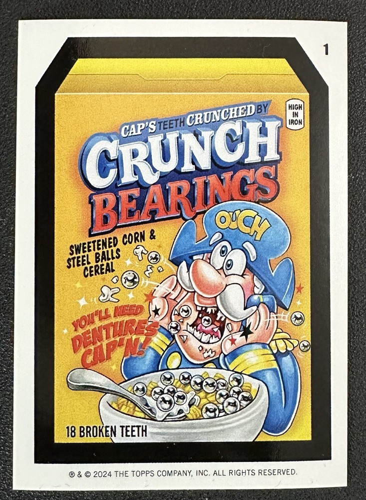 2024 Topps Wacky Packages ANS #1 CRUNCH BEARINGS coupon card in Toploader Your card will be put in an Ultra•Pro Card Sleeve, a Toploader, and then put into a Team Bag 2024 Wacky Packages All-New Series Overview Wacky Packages ALL NEW SERIES has returned for a 2024 release exclusively on Topps.com. This set features 50 brand new gags done by some of your favorite Wacky Packages artists. Look for Sketch cards, Foil Parallels, Coupons and much more - a laugh riot in every pack! 2024 Wacky Packages All-New Series Checklist 100 Sticker Base Set (50 Puzzle Backs & 50 Coupon Backs) 1 Sticker Base Crunch Bearings Puzzle - Crunch 1 Sticker Base Crunch Bearings Coupon 2 Sticker Base Quasar Oats Puzzle - Crunch 2 Sticker Base Quasar Oats Coupon 3 Sticker Base Simply Strange Puzzle - Crunch 3 Sticker Base Simply Strange Coupon 4 Sticker Base Fartnite Puzzle - Crunch 4 Sticker Base Fartnite Coupon 5 Sticker Base Perk Puzzle - Crunch 5 Sticker Base Perk Coupon 6 Sticker Base Glands Puzzle - Crunch 6 Sticker Base Glands Coupon 7 Sticker Base Larva Bar Puzzle - Crunch 7 Sticker Base Larva Bar Coupon 8 Sticker Base Ache A Lot Puzzle - Crunch 8 Sticker Base Ache A Lot Coupon 9 Sticker Base Clariton Puzzle - Crunch 9 Sticker Base Clariton Coupon 10 Sticker Base Prowrestle Puzzle - My Sickle 10 Sticker Base Prowrestle Coupon 11 Sticker Base My Sickle Puzzle - My Sickle 11 Sticker Base My Sickle Coupon 12 Sticker Base Singles Puzzle - My Sickle 12 Sticker Base Singles Coupon 13 Sticker Base Mtn Chew Puzzle - My Sickle 13 Sticker Base Mtn Chew Coupon 14 Sticker Base Moo Pie Puzzle - My Sickle 14 Sticker Base Moo Pie Coupon 15 Sticker Base Sloppecito Puzzle - My Sickle 15 Sticker Base Sloppecito Coupon 16 Sticker Base Bear Heads Puzzle - My Sickle 16 Sticker Base Bear Heads Coupon 17 Sticker Base Plucky Charms Puzzle - My Sickle 17 Sticker Base Plucky Charms Coupon 18 Sticker Base Clowny Puzzle - My Sickle 18 Sticker Base Clowny Coupon 19 Sticker Base Hive Nights Puzzle - Starbugs 19 Sticker Base Hive Nights Coupon 20 Sticker Base In Prison Puzzle - Starbugs 20 Sticker Base In Prison Coupon 21 Sticker Base Jest Puzzle - Starbugs 21 Sticker Base Jest Coupon 22 Sticker Base Jokey Puzzle - Starbugs 22 Sticker Base Jokey Coupon 23 Sticker Base Bubble Bee Puzzle - Starbugs 23 Sticker Base Bubble Bee Coupon 24 Sticker Base Oareo Puzzle - Starbugs 24 Sticker Base Oareo Coupon 25 Sticker Base Stickeys Puzzle - Starbugs 25 Sticker Base Stickeys Coupon 26 Sticker Base Noosance Puzzle - Starbugs 26 Sticker Base Noosance Coupon 27 Sticker Base Starbugs Puzzle - Starbugs 27 Sticker Base Starbugs Coupon 28 Sticker Base Muddy Babbies Puzzle - Dead's 28 Sticker Base Muddy Babbies Coupon 29 Sticker Base Sugar Caddy Puzzle - Dead's 29 Sticker Base Sugar Caddy Coupon 30 Sticker Base Hot Snails Puzzle - Dead's 30 Sticker Base Hot Snails Coupon 31 Sticker Base Suffer Puzzle - Dead's 31 Sticker Base Suffer Coupon 32 Sticker Base Spawn Puzzle - Dead's 32 Sticker Base Spawn Coupon 33 Sticker Base Tombleron Puzzle - Dead's 33 Sticker Base Tombleron Coupon 34 Sticker Base Dead's Puzzle - Dead's 34 Sticker Base Dead's Coupon 35 Sticker Base Rot Shot Puzzle - Dead's 35 Sticker Base Rot Shot Coupon 36 Sticker Base Pop Coroners Puzzle - Dead's 36 Sticker Base Pop Coroners Coupon 37 Sticker Base Play-Bro Puzzle - Kooky Crisp 37 Sticker Base Play-Bro Coupon 38 Sticker Base Ate 1 Puzzle - Kooky Crisp 38 Sticker Base Ate 1 Coupon 39 Sticker Base Bagel Frights Puzzle - Kooky Crisp 39 Sticker Base Bagel Frights Coupon 40 Sticker Base Nix Puzzle - Kooky Crisp 40 Sticker Base Nix Coupon 41 Sticker Base Bite Guard Puzzle - Kooky Crisp 41 Sticker Base Bite Guard Coupon 42 Sticker Base Hot Logs Puzzle - Kooky Crisp 42 Sticker Base Hot Logs Coupon 43 Sticker Base Kooky Crisp Puzzle - Kooky Crisp 43 Sticker Base Kooky Crisp Coupon 44 Sticker Base Ring Ding Puzzle - Kooky Crisp 44 Sticker Base Ring Ding Coupon 45 Sticker Base Spatial K Puzzle - Kooky Crisp 45 Sticker Base Spatial K Coupon 46 Sticker Base Snails Finished Puzzle 1 46 Sticker Base Snails Coupon 47 Sticker Base Pet Finished Puzzle 2 47 Sticker Base Pet Coupon 48 Sticker Base Blown Pop Finished Puzzle 3 48 Sticker Base Blown Pop Coupon 49 Sticker Base Noscafe Finished Puzzle 4 49 Sticker Base Noscafe Coupon 50 Sticker Base L.L. Scream Finished Puzzle 5 50 Sticker Base L.L. Scream Coupon 1 18C1S Base Checklist Flashback to 74 1 Sticker Insert EvilTime 2 Sticker Insert SoftHead Lightbulbs 3 Sticker Insert Big Muc 4 Sticker Insert Creature Crackers 5 Sticker Insert Burpsi Cola 6 Sticker Insert Suffertone 7 Sticker Insert Hooky 8 Sticker Insert Pupsi 9 Sticker Insert Sunsweat 10 Sticker Insert Mud Magazine Mars Attacks Wacky Packs 1 Sticker Insert Quasar Oats 2 Sticker Insert Pet 3 Sticker Insert Noosance 4 Sticker Insert Spawn 5 Sticker Insert Simply Strange Wacky Pals Comics 1 Sticker Insert SoftHead Lightbulbs 2 Sticker Insert EvilTime 3 Sticker Insert Pupsi 4 Sticker Insert Creature Crackers 5 Sticker Insert Big Muc 6 Sticker Insert Burpsi Cola 7 Sticker Insert Imbecile Blank Crows 8 Sticker Insert 3 Mosquitoes 9 Sticker Insert Monotony 10 Sticker Insert Kentucky Fried Fingers