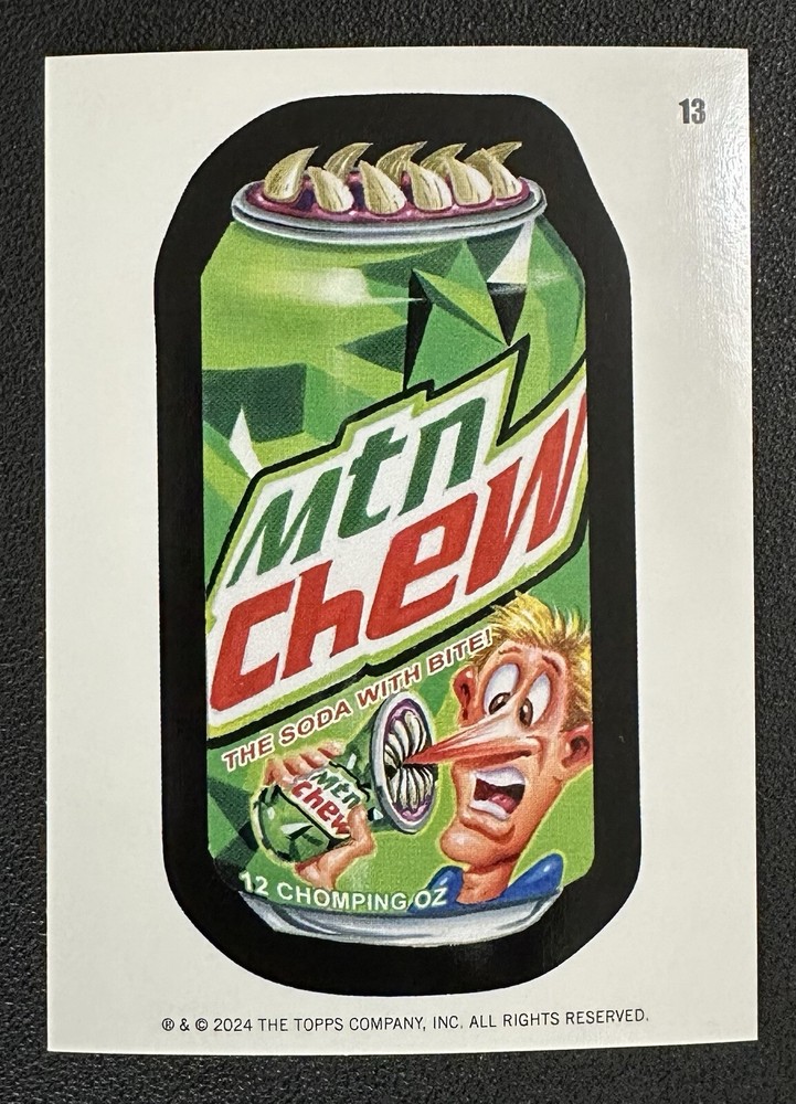 2024 Topps Wacky Packages ANS #13 MTN CHEW coupon in Toploader parody card of Mountain Dew Your card will be put in an Ultra•Pro Card Sleeve, a Toploader, and then put into a Team Bag 2024 Wacky Packages All-New Series Overview Wacky Packages ALL NEW SERIES has returned for a 2024 release exclusively on Topps.com. This set features 50 brand new gags done by some of your favorite Wacky Packages artists. Look for Sketch cards, Foil Parallels, Coupons and much more - a laugh riot in every pack! 2024 Wacky Packages All-New Series Checklist 100 Sticker Base Set (50 Puzzle Backs & 50 Coupon Backs) 1 Sticker Base Crunch Bearings Puzzle - Crunch 1 Sticker Base Crunch Bearings Coupon 2 Sticker Base Quasar Oats Puzzle - Crunch 2 Sticker Base Quasar Oats Coupon 3 Sticker Base Simply Strange Puzzle - Crunch 3 Sticker Base Simply Strange Coupon 4 Sticker Base Fartnite Puzzle - Crunch 4 Sticker Base Fartnite Coupon 5 Sticker Base Perk Puzzle - Crunch 5 Sticker Base Perk Coupon 6 Sticker Base Glands Puzzle - Crunch 6 Sticker Base Glands Coupon 7 Sticker Base Larva Bar Puzzle - Crunch 7 Sticker Base Larva Bar Coupon 8 Sticker Base Ache A Lot Puzzle - Crunch 8 Sticker Base Ache A Lot Coupon 9 Sticker Base Clariton Puzzle - Crunch 9 Sticker Base Clariton Coupon 10 Sticker Base Prowrestle Puzzle - My Sickle 10 Sticker Base Prowrestle Coupon 11 Sticker Base My Sickle Puzzle - My Sickle 11 Sticker Base My Sickle Coupon 12 Sticker Base Singles Puzzle - My Sickle 12 Sticker Base Singles Coupon 13 Sticker Base Mtn Chew Puzzle - My Sickle 13 Sticker Base Mtn Chew Coupon 14 Sticker Base Moo Pie Puzzle - My Sickle 14 Sticker Base Moo Pie Coupon 15 Sticker Base Sloppecito Puzzle - My Sickle 15 Sticker Base Sloppecito Coupon 16 Sticker Base Bear Heads Puzzle - My Sickle 16 Sticker Base Bear Heads Coupon 17 Sticker Base Plucky Charms Puzzle - My Sickle 17 Sticker Base Plucky Charms Coupon 18 Sticker Base Clowny Puzzle - My Sickle 18 Sticker Base Clowny Coupon 19 Sticker Base Hive Nights Puzzle - Starbugs 19 Sticker Base Hive Nights Coupon 20 Sticker Base In Prison Puzzle - Starbugs 20 Sticker Base In Prison Coupon 21 Sticker Base Jest Puzzle - Starbugs 21 Sticker Base Jest Coupon 22 Sticker Base Jokey Puzzle - Starbugs 22 Sticker Base Jokey Coupon 23 Sticker Base Bubble Bee Puzzle - Starbugs 23 Sticker Base Bubble Bee Coupon 24 Sticker Base Oareo Puzzle - Starbugs 24 Sticker Base Oareo Coupon 25 Sticker Base Stickeys Puzzle - Starbugs 25 Sticker Base Stickeys Coupon 26 Sticker Base Noosance Puzzle - Starbugs 26 Sticker Base Noosance Coupon 27 Sticker Base Starbugs Puzzle - Starbugs 27 Sticker Base Starbugs Coupon 28 Sticker Base Muddy Babbies Puzzle - Dead's 28 Sticker Base Muddy Babbies Coupon 29 Sticker Base Sugar Caddy Puzzle - Dead's 29 Sticker Base Sugar Caddy Coupon 30 Sticker Base Hot Snails Puzzle - Dead's 30 Sticker Base Hot Snails Coupon 31 Sticker Base Suffer Puzzle - Dead's 31 Sticker Base Suffer Coupon 32 Sticker Base Spawn Puzzle - Dead's 32 Sticker Base Spawn Coupon 33 Sticker Base Tombleron Puzzle - Dead's 33 Sticker Base Tombleron Coupon 34 Sticker Base Dead's Puzzle - Dead's 34 Sticker Base Dead's Coupon 35 Sticker Base Rot Shot Puzzle - Dead's 35 Sticker Base Rot Shot Coupon 36 Sticker Base Pop Coroners Puzzle - Dead's 36 Sticker Base Pop Coroners Coupon 37 Sticker Base Play-Bro Puzzle - Kooky Crisp 37 Sticker Base Play-Bro Coupon 38 Sticker Base Ate 1 Puzzle - Kooky Crisp 38 Sticker Base Ate 1 Coupon 39 Sticker Base Bagel Frights Puzzle - Kooky Crisp 39 Sticker Base Bagel Frights Coupon 40 Sticker Base Nix Puzzle - Kooky Crisp 40 Sticker Base Nix Coupon 41 Sticker Base Bite Guard Puzzle - Kooky Crisp 41 Sticker Base Bite Guard Coupon 42 Sticker Base Hot Logs Puzzle - Kooky Crisp 42 Sticker Base Hot Logs Coupon 43 Sticker Base Kooky Crisp Puzzle - Kooky Crisp 43 Sticker Base Kooky Crisp Coupon 44 Sticker Base Ring Ding Puzzle - Kooky Crisp 44 Sticker Base Ring Ding Coupon 45 Sticker Base Spatial K Puzzle - Kooky Crisp 45 Sticker Base Spatial K Coupon 46 Sticker Base Snails Finished Puzzle 1 46 Sticker Base Snails Coupon 47 Sticker Base Pet Finished Puzzle 2 47 Sticker Base Pet Coupon 48 Sticker Base Blown Pop Finished Puzzle 3 48 Sticker Base Blown Pop Coupon 49 Sticker Base Noscafe Finished Puzzle 4 49 Sticker Base Noscafe Coupon 50 Sticker Base L.L. Scream Finished Puzzle 5 50 Sticker Base L.L. Scream Coupon 1 18C1S Base Checklist Flashback to 74 1 Sticker Insert EvilTime 2 Sticker Insert SoftHead Lightbulbs 3 Sticker Insert Big Muc 4 Sticker Insert Creature Crackers 5 Sticker Insert Burpsi Cola 6 Sticker Insert Suffertone 7 Sticker Insert Hooky 8 Sticker Insert Pupsi 9 Sticker Insert Sunsweat 10 Sticker Insert Mud Magazine Mars Attacks Wacky Packs 1 Sticker Insert Quasar Oats 2 Sticker Insert Pet 3 Sticker Insert Noosance 4 Sticker Insert Spawn 5 Sticker Insert Simply Strange Wacky Pals Comics 1 Sticker Insert SoftHead Lightbulbs 2 Sticker Insert EvilTime 3 Sticker Insert Pupsi 4 Sticker Insert Creature Crackers 5 Sticker Insert Big Muc 6 Sticker Insert Burpsi Cola 7 Sticker Insert Imbecile Blank Crows 8 Sticker Insert 3 Mosquitoes 9 Sticker Insert Monotony 10 Sticker Insert Kentucky Fried Fingers