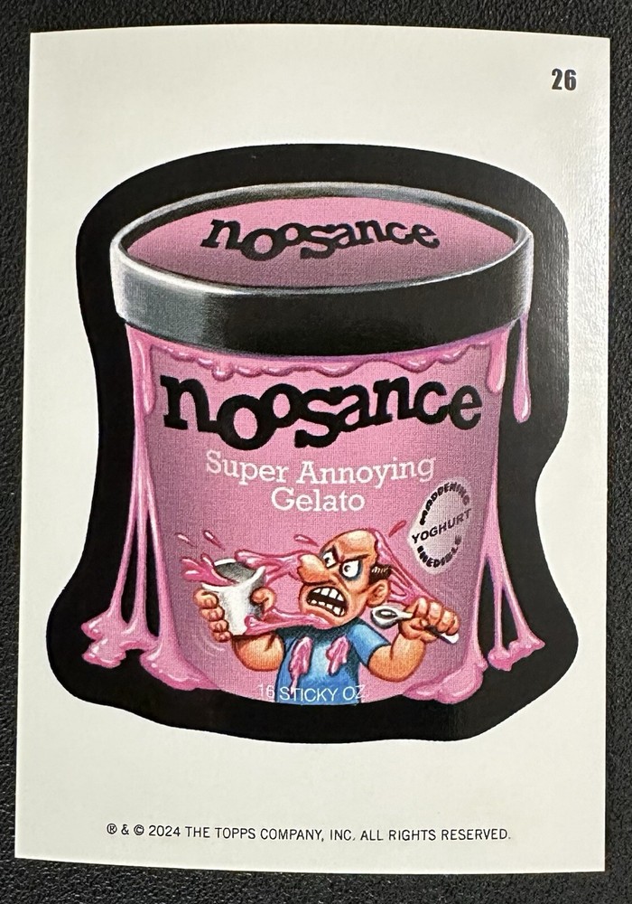 2024 Topps Wacky Packages ANS #26 NOOSANCE cards coupon in Toploader parody card Your card will be put in an Ultra•Pro Card Sleeve, a Toploader, and then put into a Team Bag 2024 Wacky Packages All-New Series Overview Wacky Packages ALL NEW SERIES has returned for a 2024 release exclusively on Topps.com. This set features 50 brand new gags done by some of your favorite Wacky Packages artists. Look for Sketch cards, Foil Parallels, Coupons and much more - a laugh riot in every pack! 2024 Wacky Packages All-New Series Checklist 100 Sticker Base Set (50 Puzzle Backs & 50 Coupon Backs) 1 Sticker Base Crunch Bearings Puzzle - Crunch 1 Sticker Base Crunch Bearings Coupon 2 Sticker Base Quasar Oats Puzzle - Crunch 2 Sticker Base Quasar Oats Coupon 3 Sticker Base Simply Strange Puzzle - Crunch 3 Sticker Base Simply Strange Coupon 4 Sticker Base Fartnite Puzzle - Crunch 4 Sticker Base Fartnite Coupon 5 Sticker Base Perk Puzzle - Crunch 5 Sticker Base Perk Coupon 6 Sticker Base Glands Puzzle - Crunch 6 Sticker Base Glands Coupon 7 Sticker Base Larva Bar Puzzle - Crunch 7 Sticker Base Larva Bar Coupon 8 Sticker Base Ache A Lot Puzzle - Crunch 8 Sticker Base Ache A Lot Coupon 9 Sticker Base Clariton Puzzle - Crunch 9 Sticker Base Clariton Coupon 10 Sticker Base Prowrestle Puzzle - My Sickle 10 Sticker Base Prowrestle Coupon 11 Sticker Base My Sickle Puzzle - My Sickle 11 Sticker Base My Sickle Coupon 12 Sticker Base Singles Puzzle - My Sickle 12 Sticker Base Singles Coupon 13 Sticker Base Mtn Chew Puzzle - My Sickle 13 Sticker Base Mtn Chew Coupon 14 Sticker Base Moo Pie Puzzle - My Sickle 14 Sticker Base Moo Pie Coupon 15 Sticker Base Sloppecito Puzzle - My Sickle 15 Sticker Base Sloppecito Coupon 16 Sticker Base Bear Heads Puzzle - My Sickle 16 Sticker Base Bear Heads Coupon 17 Sticker Base Plucky Charms Puzzle - My Sickle 17 Sticker Base Plucky Charms Coupon 18 Sticker Base Clowny Puzzle - My Sickle 18 Sticker Base Clowny Coupon 19 Sticker Base Hive Nights Puzzle - Starbugs 19 Sticker Base Hive Nights Coupon 20 Sticker Base In Prison Puzzle - Starbugs 20 Sticker Base In Prison Coupon 21 Sticker Base Jest Puzzle - Starbugs 21 Sticker Base Jest Coupon 22 Sticker Base Jokey Puzzle - Starbugs 22 Sticker Base Jokey Coupon 23 Sticker Base Bubble Bee Puzzle - Starbugs 23 Sticker Base Bubble Bee Coupon 24 Sticker Base Oareo Puzzle - Starbugs 24 Sticker Base Oareo Coupon 25 Sticker Base Stickeys Puzzle - Starbugs 25 Sticker Base Stickeys Coupon 26 Sticker Base Noosance Puzzle - Starbugs 26 Sticker Base Noosance Coupon 27 Sticker Base Starbugs Puzzle - Starbugs 27 Sticker Base Starbugs Coupon 28 Sticker Base Muddy Babbies Puzzle - Dead's 28 Sticker Base Muddy Babbies Coupon 29 Sticker Base Sugar Caddy Puzzle - Dead's 29 Sticker Base Sugar Caddy Coupon 30 Sticker Base Hot Snails Puzzle - Dead's 30 Sticker Base Hot Snails Coupon 31 Sticker Base Suffer Puzzle - Dead's 31 Sticker Base Suffer Coupon 32 Sticker Base Spawn Puzzle - Dead's 32 Sticker Base Spawn Coupon 33 Sticker Base Tombleron Puzzle - Dead's 33 Sticker Base Tombleron Coupon 34 Sticker Base Dead's Puzzle - Dead's 34 Sticker Base Dead's Coupon 35 Sticker Base Rot Shot Puzzle - Dead's 35 Sticker Base Rot Shot Coupon 36 Sticker Base Pop Coroners Puzzle - Dead's 36 Sticker Base Pop Coroners Coupon 37 Sticker Base Play-Bro Puzzle - Kooky Crisp 37 Sticker Base Play-Bro Coupon 38 Sticker Base Ate 1 Puzzle - Kooky Crisp 38 Sticker Base Ate 1 Coupon 39 Sticker Base Bagel Frights Puzzle - Kooky Crisp 39 Sticker Base Bagel Frights Coupon 40 Sticker Base Nix Puzzle - Kooky Crisp 40 Sticker Base Nix Coupon 41 Sticker Base Bite Guard Puzzle - Kooky Crisp 41 Sticker Base Bite Guard Coupon 42 Sticker Base Hot Logs Puzzle - Kooky Crisp 42 Sticker Base Hot Logs Coupon 43 Sticker Base Kooky Crisp Puzzle - Kooky Crisp 43 Sticker Base Kooky Crisp Coupon 44 Sticker Base Ring Ding Puzzle - Kooky Crisp 44 Sticker Base Ring Ding Coupon 45 Sticker Base Spatial K Puzzle - Kooky Crisp 45 Sticker Base Spatial K Coupon 46 Sticker Base Snails Finished Puzzle 1 46 Sticker Base Snails Coupon 47 Sticker Base Pet Finished Puzzle 2 47 Sticker Base Pet Coupon 48 Sticker Base Blown Pop Finished Puzzle 3 48 Sticker Base Blown Pop Coupon 49 Sticker Base Noscafe Finished Puzzle 4 49 Sticker Base Noscafe Coupon 50 Sticker Base L.L. Scream Finished Puzzle 5 50 Sticker Base L.L. Scream Coupon 1 18C1S Base Checklist Flashback to 74 1 Sticker Insert EvilTime 2 Sticker Insert SoftHead Lightbulbs 3 Sticker Insert Big Muc 4 Sticker Insert Creature Crackers 5 Sticker Insert Burpsi Cola 6 Sticker Insert Suffertone 7 Sticker Insert Hooky 8 Sticker Insert Pupsi 9 Sticker Insert Sunsweat 10 Sticker Insert Mud Magazine Mars Attacks Wacky Packs 1 Sticker Insert Quasar Oats 2 Sticker Insert Pet 3 Sticker Insert Noosance 4 Sticker Insert Spawn 5 Sticker Insert Simply Strange Wacky Pals Comics 1 Sticker Insert SoftHead Lightbulbs 2 Sticker Insert EvilTime 3 Sticker Insert Pupsi 4 Sticker Insert Creature Crackers 5 Sticker Insert Big Muc 6 Sticker Insert Burpsi Cola 7 Sticker Insert Imbecile Blank Crows 8 Sticker Insert 3 Mosquitoes 9 Sticker Insert Monotony 10 Sticker Insert Kentucky Fried Fingers