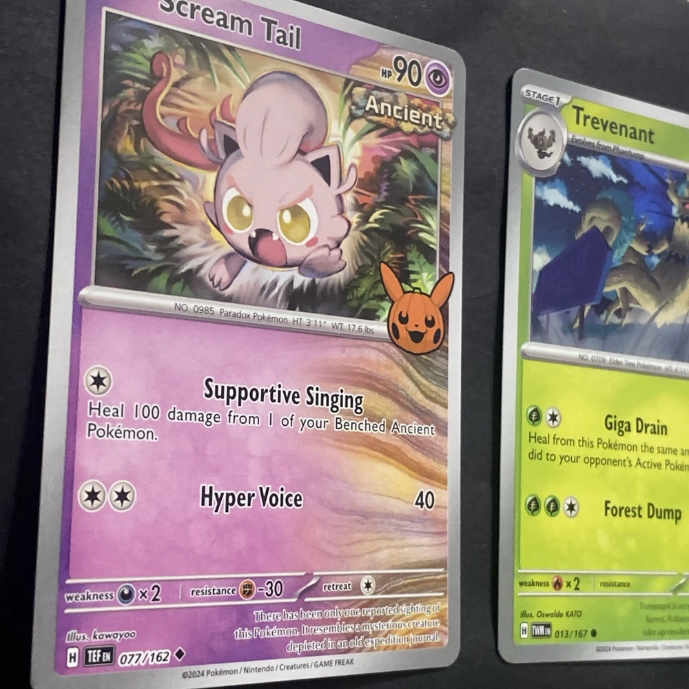 Dive into the world of Pokémon TCG with this exclusive lot of 2024 Trick Or Trade cards, featuring the enigmatic Scream Tail Trevenant and the fiery Fuecoco. Each card is a piece of the captivating Trick Or Treat set, designed to delight both collectors and players alike. The set includes cards numbered 89, 24, 25, and 90, each showcasing the unique abilities and artwork that make the Pokémon series so engaging. Crafted by Millennium Print Group, these cards come in standard size and feature a regular and holo finish, adding a touch of shine to your collection. The lot includes English-language cards, manufactured in the United States, ensuring a quality addition to your Pokémon TCG arsenal. Suitable for ages 4 and up, these cards are a fantastic way to start or enrich any existing collection.