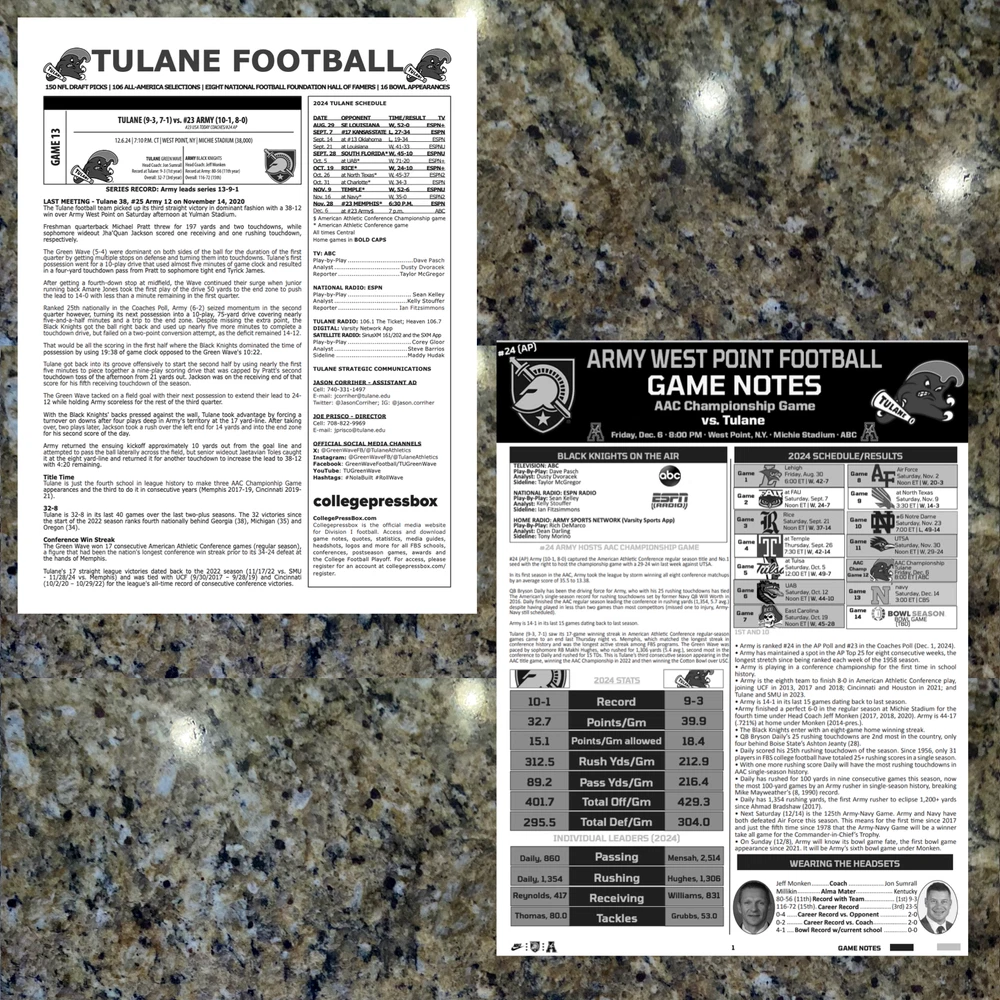 For sale, the game issued Flipcard and team program notes from the 2024 AAC Confrence Championship game - Tulane vs Army at Michie Stadium . Only given to media and broadcast for the game. History! GAME: 2024 AAC FOOTBALL CHAMPIONSHIP GAME Tulane (9-3) at Army (10-1) Friday, December 6, 2024 Michie Stadium | West Point, New York What you get: 1. 11x17 Game Issued Media Issued Flipcard - Tulane vs Army 2. Army game program note sheet (1 page) 3. Tulane game program note sheet (1 page) 4. Plastic protector sheet