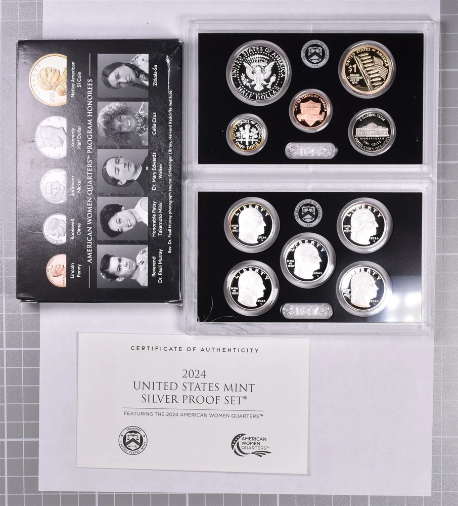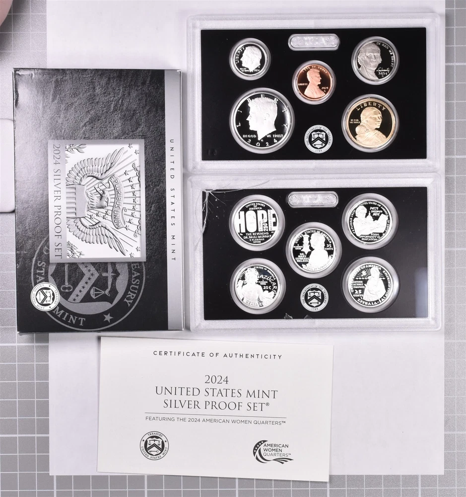 2024 U.S. Mint Silver Proof 10 Coin Set - Plastic Is Cracked! Plastic is heavily cracked on the Quarters Set. Pieces of plastic are floating in the set. The other half of the set the plastic is fine. Item in photos is the actual item you will receive, except when "STOCK PHOTOS" is noted above. Item ID: 79632 Shipping: We combine shipping for multiple item purchases - MUST BE PAID TOGETHER! PLEASE - Bid and buy at your leisure for combined shipping - we request you pay combined items within 10 days of first item won. We are unable to honor requests for combined shipping discounts if items have been paid separately. eBay does show our combined shipping on the shipping tab. If you're purchasing a large number of items, or several boxed items, request a total from seller and we'll pre-pack to get you an accurate shipping cost. We use Flat Rate mailing supplies as much as possible. FAST shipping via United States Postal Service (USPS) We ship Monday - Friday every week, excluding holidays. Most orders paid by 10AM Eastern Time on weekdays will ship same day. When your order is ready for dispatch: - Tracking will be updated on the order details - Tracking will be e-mailed to your registered eBay e-mail address - Positive feedback will be left. If you have not received tracking details or Positive Feedback within 5 days of your payment, contact us through your order details page. Insurance: Your investment is covered by third party parcel insurance and/or U.S. Postal Service Insurance. By bidding/buying, you agree to cooperate with the insurance claims process on lost, stolen, or damaged shipments. If you would like details on the claims process before bidding, feel free to e-mail us. Tax: eBay collects and administers the Sales Tax on a per-state basis. We have no control over the administration of tax. Requests for refunds of Sales Tax will not be honored. If you feel an exemption is warranted, we can only recommend you contact eBay directly. Returns: We accept returns for refund on all unaltered items within 30 days. - Coins removed from their packaging are non returnable. - Items sold as sealed or unopened are non returnable if opened. - We do not charge a restocking fee nor do we refund postage charges. All returns must be handled through eBay's automated return process. No returns on items marked FINAL SALE or AS-IS.