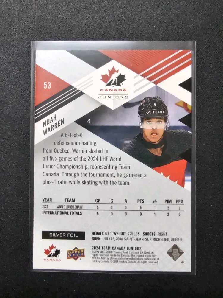 2024 Upper Deck Team Canada Foil Parallel #53 Noah Warren Sold card/cards shipped in top loader and team bag. Please see condition description/photo Thank you for buying. Instagram: cscollecxions