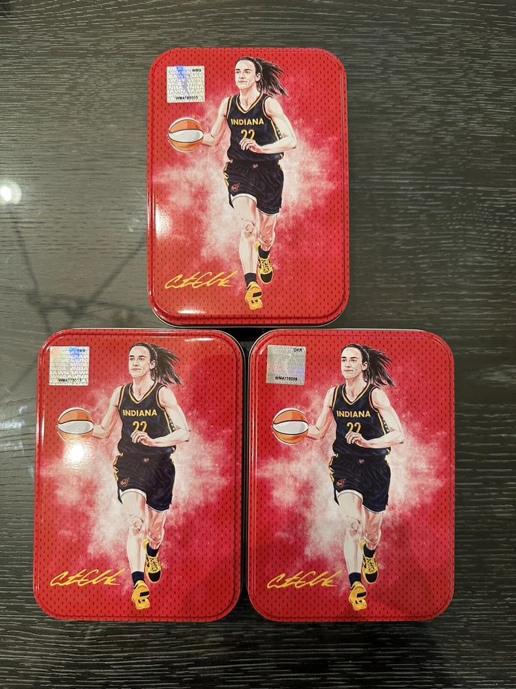 The product is a set of three empty red aluminum tins featuring the player Caitlin Clark from the Indiana Fever in the 2023-24 WNBA season. These tins are part of the 2023-24 WNBA SELECT series manufactured by Panini in 2024. The tins are designed as collectibles for sports trading cards, specifically for basketball, and may have been originally used to house exclusive player trading cards. This limited edition product would appeal to fans and collectors of the Women's National Basketball Association (WNBA) and Caitlin Clark.