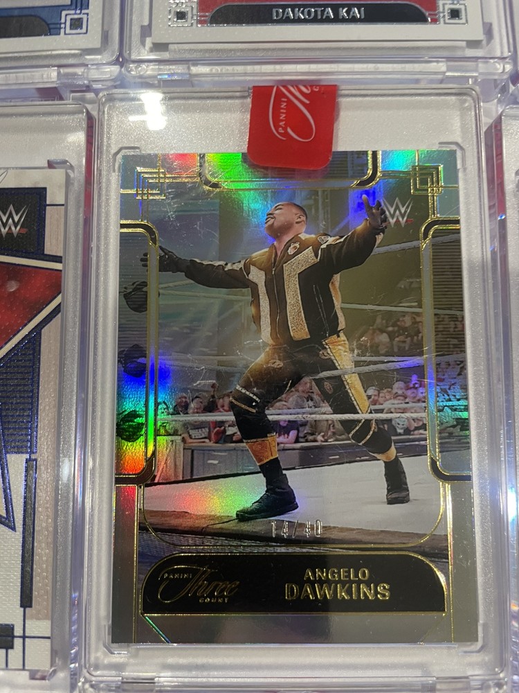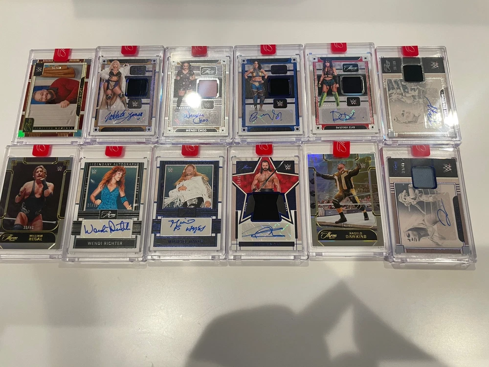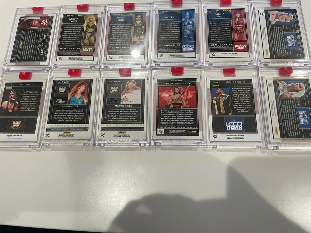The product is a lot of 12 WWE Three Count trading cards from the 2024 Panini Three Count collection. These cards feature WWE wrestlers and are designed for sports trading card enthusiasts.