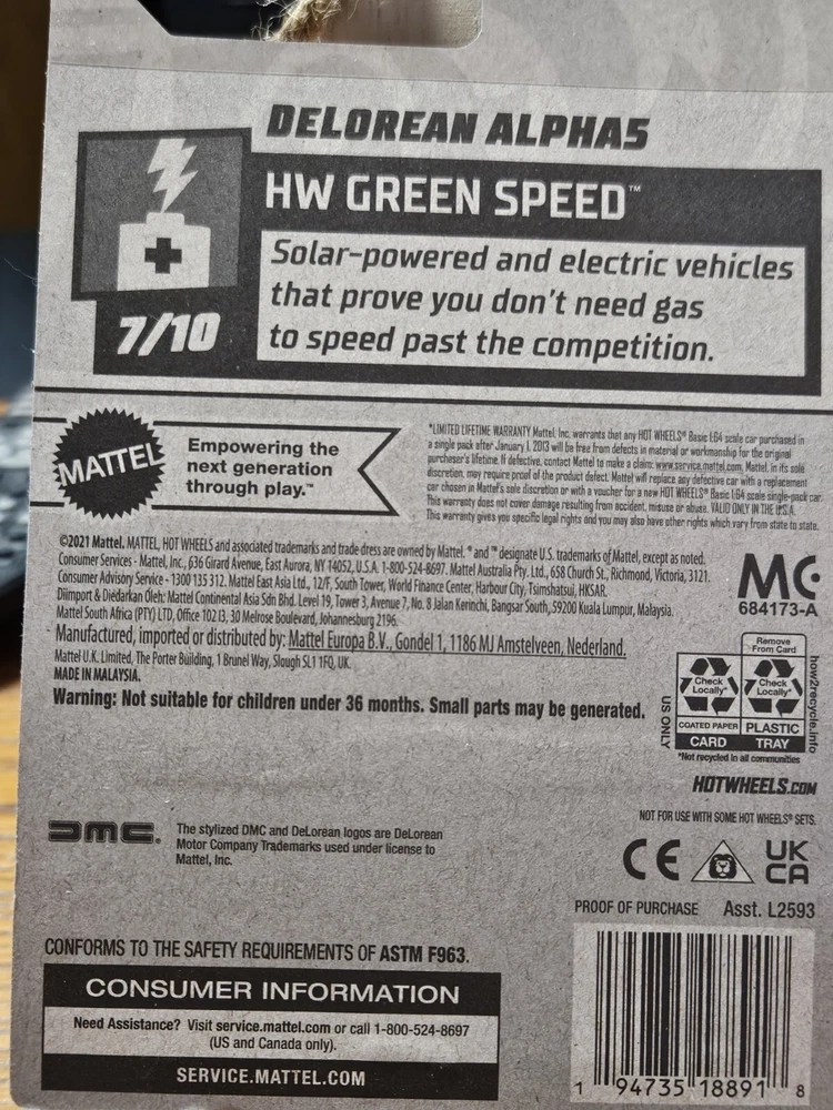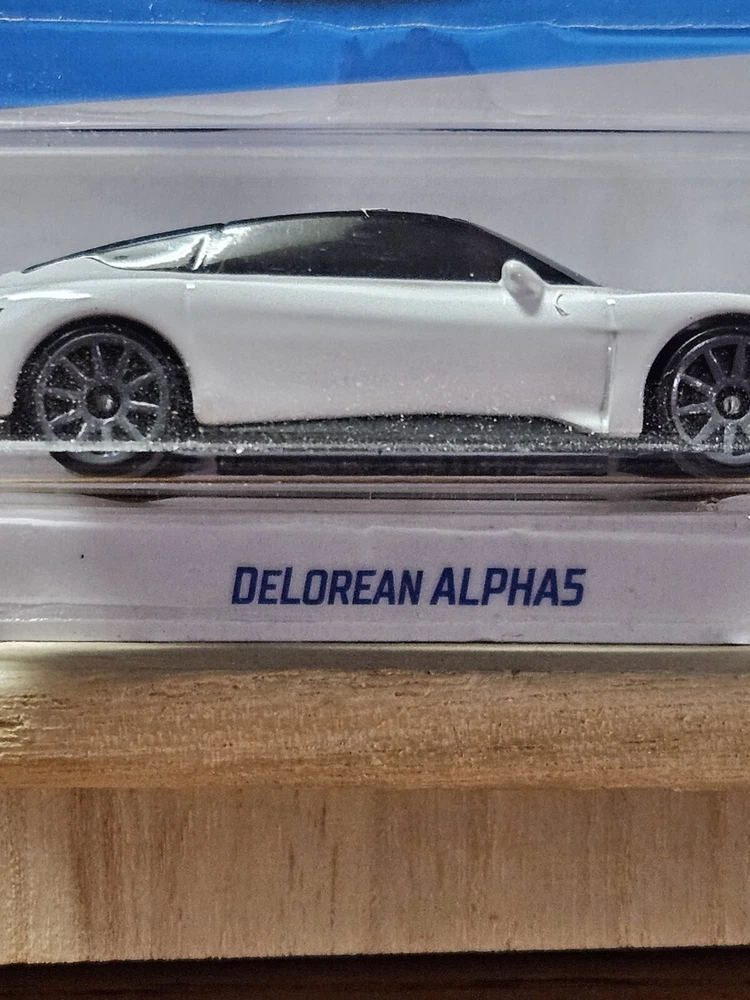 The 2024 White Delorean Alpha5 by Hot Wheels is a 1:64 scale diecast car in the HW Green Speed series. This DeLorean model is part of the 7th out of 10 releases in the series, featuring an EV theme. It is branded under Hot Wheels and is recommended for ages 3 and up, suitable for both boys and girls. The vehicle is a representation of a futuristic DeLorean design, manufactured in Malaysia in 2024 for collectors and enthusiasts alike.